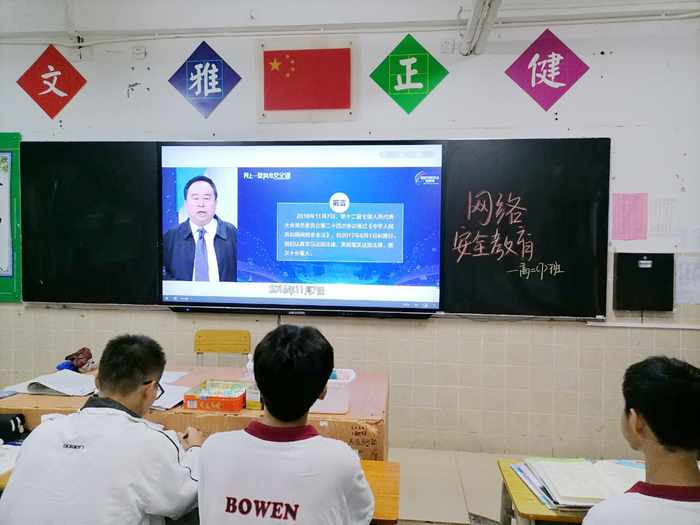 加强未成年人网络安全防护体系建设,开展网络安全教育知识普及。广东博文学校高中部通过开展“网络安全教育”主题系列活动,让学生们了解更多的网络知识,对网络利与弊有了较为全面的认识,提高了学生的分辨能力,营造了“网络安全”的良好环境,让每一位学生健康成长。