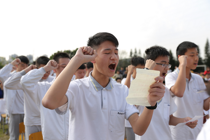 “百日倒计时”是加油站,让我们斗志昂扬。所以,我们每个人都必须踩紧油门,加足马力,向心中的目标前进,决不犹豫,因为我们没有时间犹豫。一句“气有浩然,学无止境,海到无边天作岸,山登绝顶我为峰!”进入初三各个班级学子宣誓的环节,各班的宣誓铿锵有力,气贯长虹!激发了斗志,感染了在场的每一个人,也将誓师大会的气氛推向了高潮。