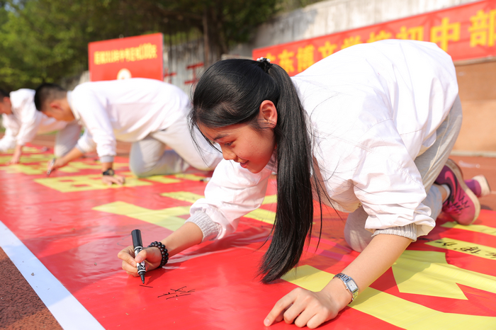 在大会宣誓环节,所有初三任课老师举起右拳,郑重宣誓:请同学们放心,我一定会:认真辅导,精心授课;言传身教,以身作则;脚踏实地,刻苦钻研;请家长们放心,我一定会:爱生如子,忠于职守;精诚团结,踏实苦干;甘于奉献,竭尽所能……老师们豪情万丈、信心满怀的誓言极大地点燃了台下同学们的激情。
