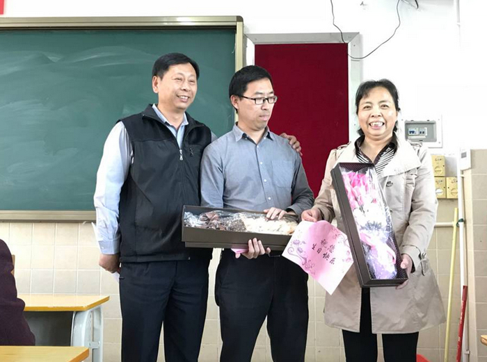 会议开始,任校请杨朋伟、李卫华两位老师上台,众人不知所以。任校告诉大家,这两位教师是在本月庆生,学部为表示祝贺,给他们准备了精心的礼物。这意外的惊喜,让两位老师感到暖意洋洋、笑意盈盈,更让在场的教职工感到博文这个大家庭的温暖。