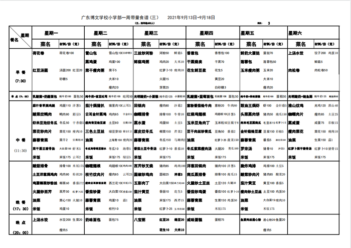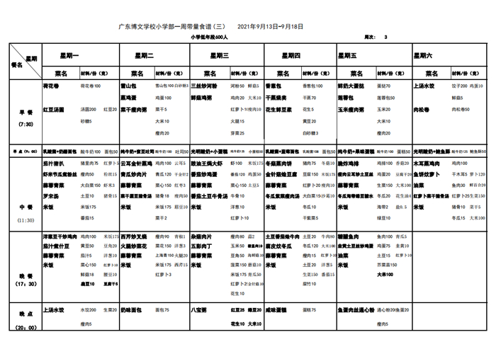 广东博文学校第三周带量食谱公示