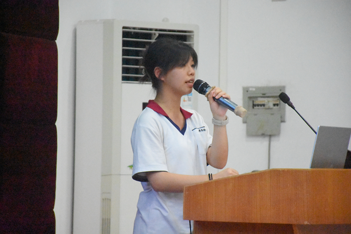 大会第二项:学生会主席高二(7)班黄颖铟讲话。黄颖铟作为学生会主席分享了许多关于学生会的工作经验,以及她作为主席对即将加入的新鲜血液的期待。