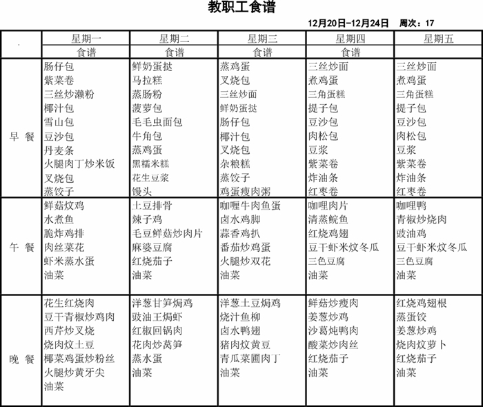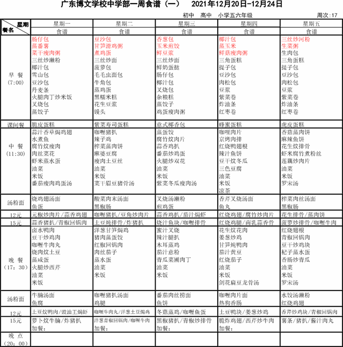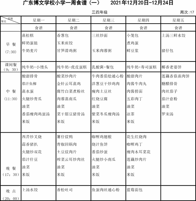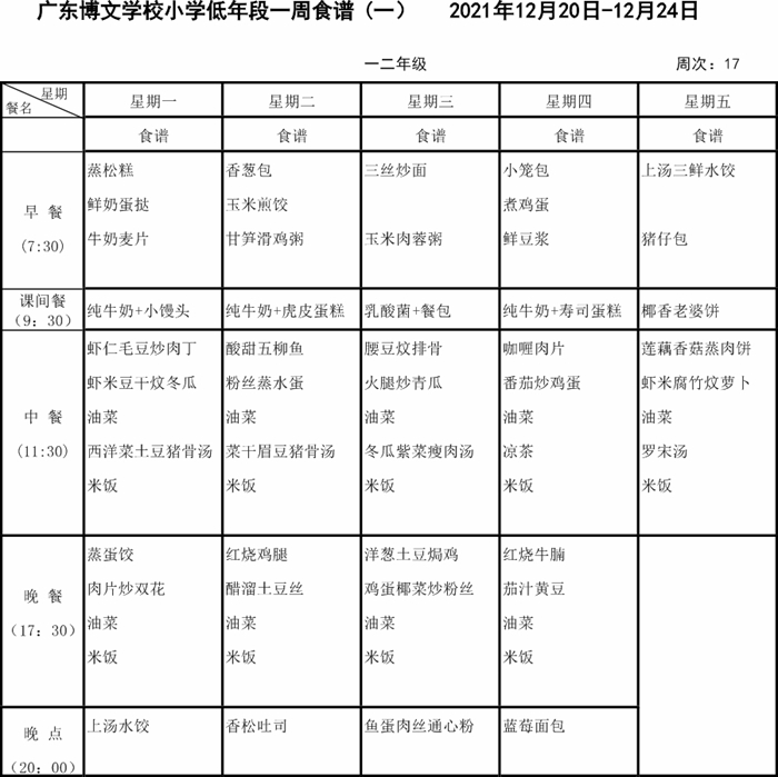 广东博文学校第十七周食谱公示