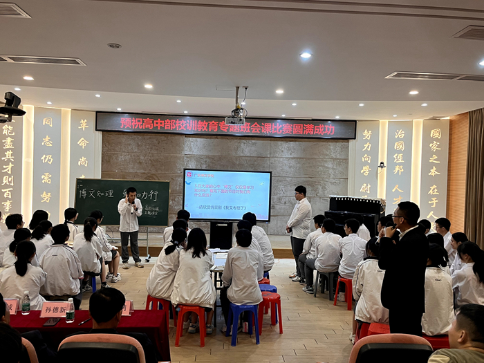 本次比赛主题从《高中校训教育》校本教材里选取,以年级为单位,各年级主题相同,各班围绕年级所定主题根据实际情况自拟班会课题目。比赛分为预赛、初赛和决赛。首先各年级进行评比,选出三名班主任参加初赛。初赛后,各年级各选出一名代表参加决赛。通过激烈角逐,高一年级苏嘉浩老师,高二年级黄静敏老师,高三年级黄宇欣老师进入决赛。