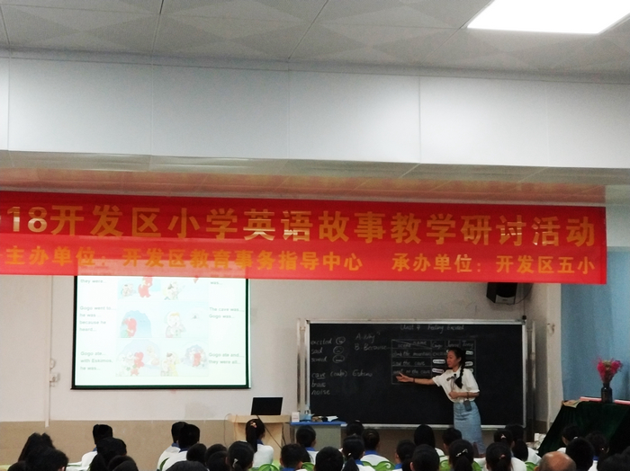 故事教学研讨活动首先由开发区第五小学沈曼琳老师、开发区第四小学兰艳丽老师分别讲授五年级上册unit5 My Favorite Activities 和六年级上册unit 4