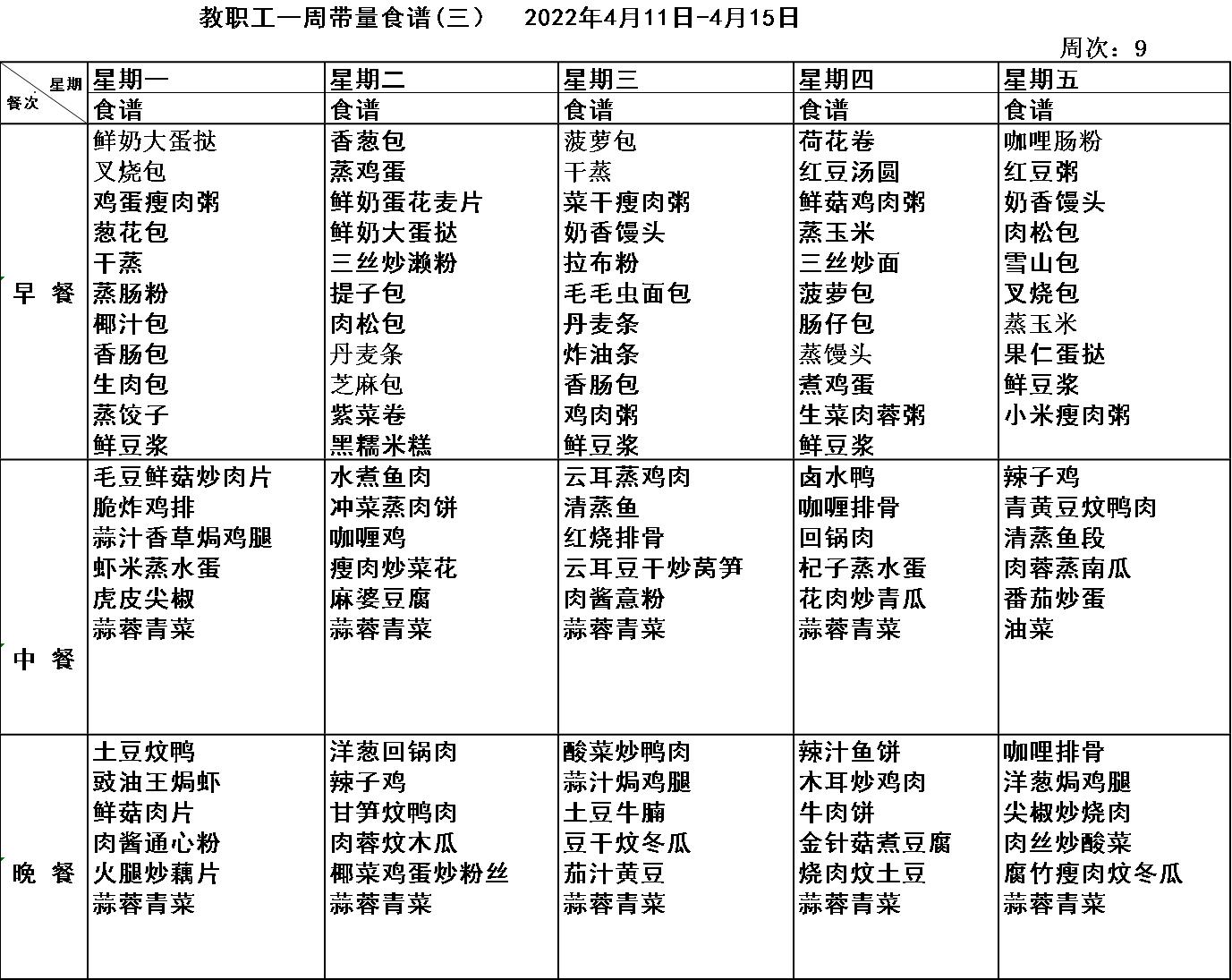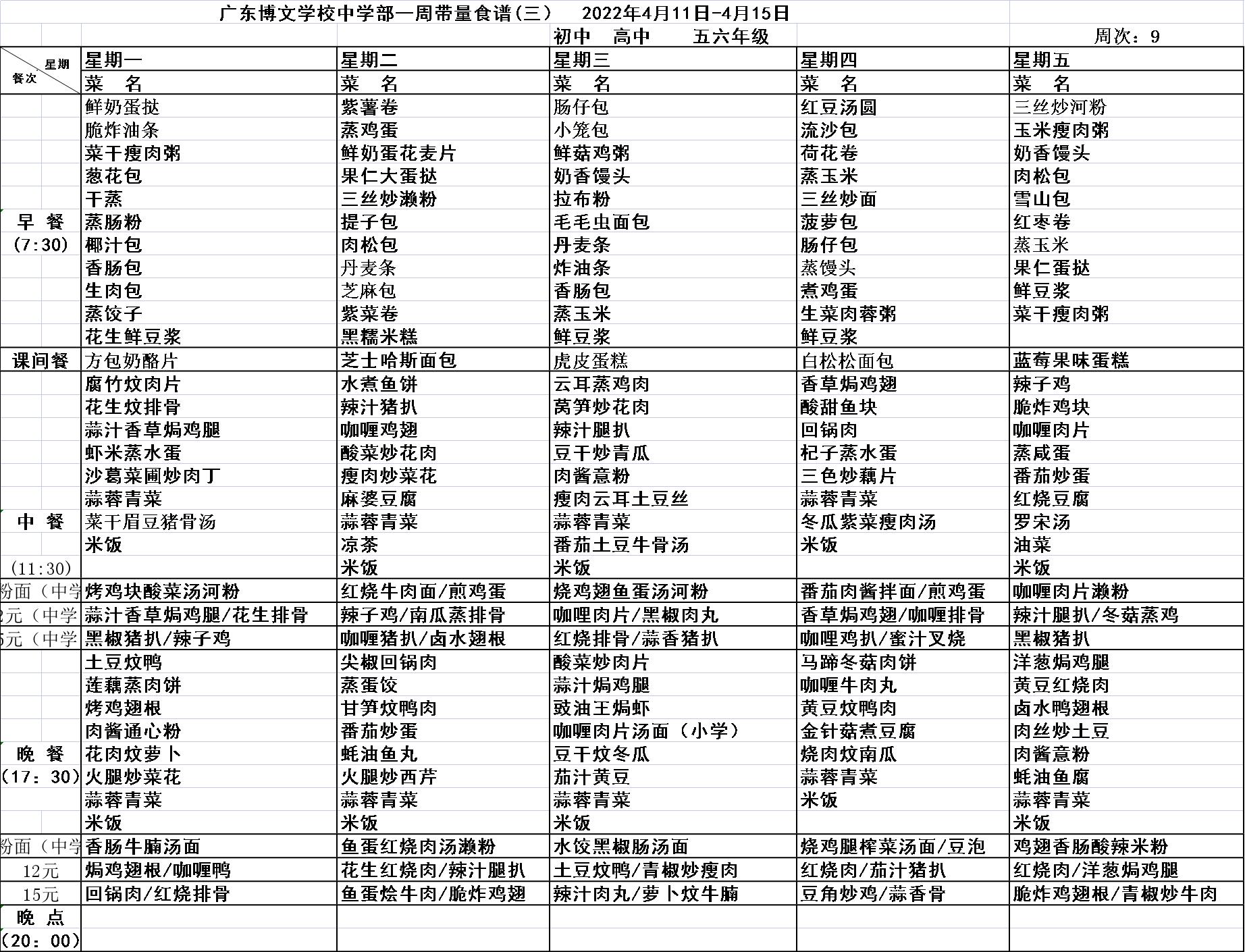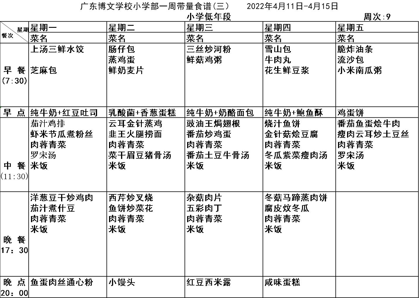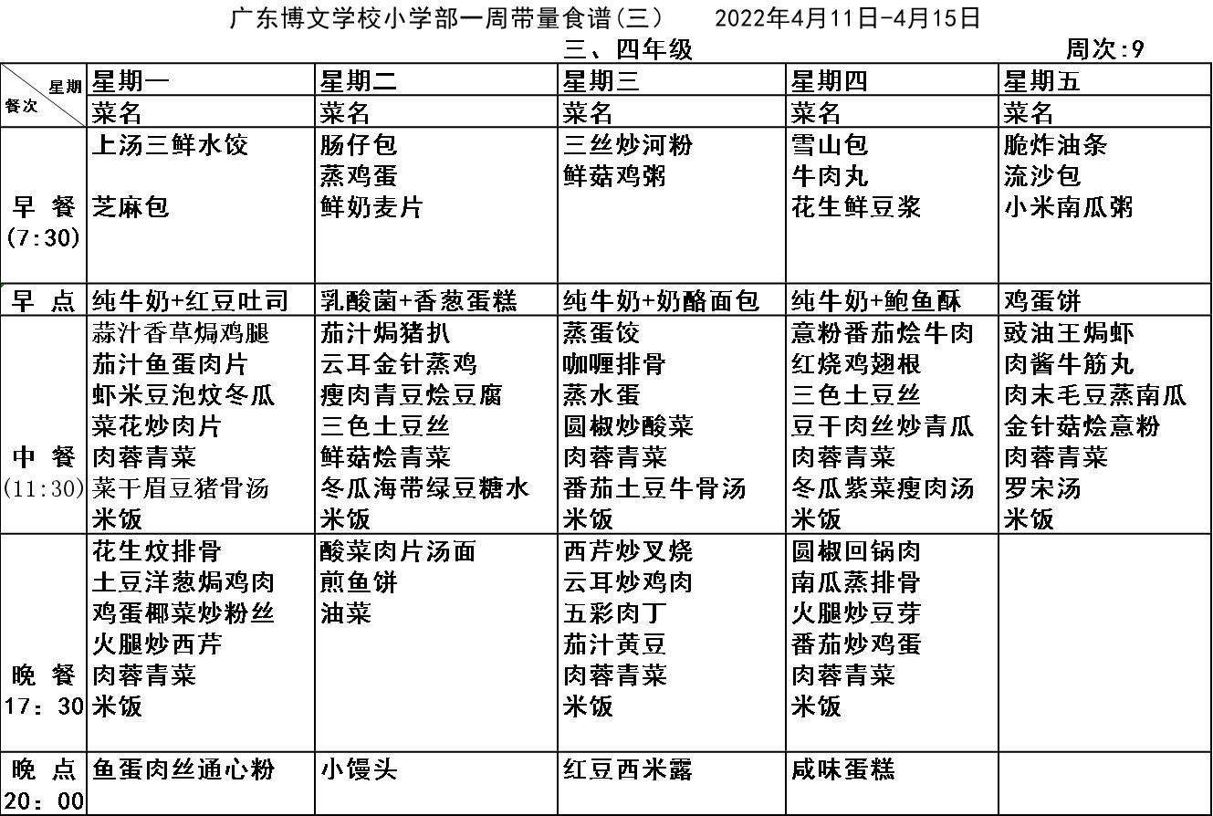 广东博文学校第9周食谱公示