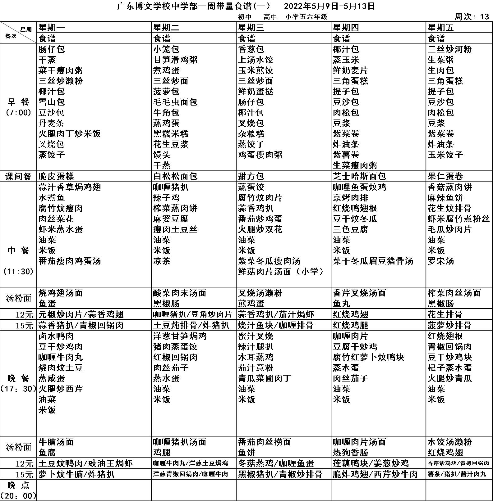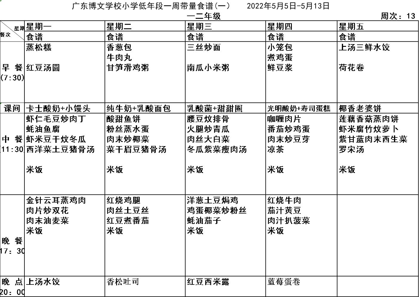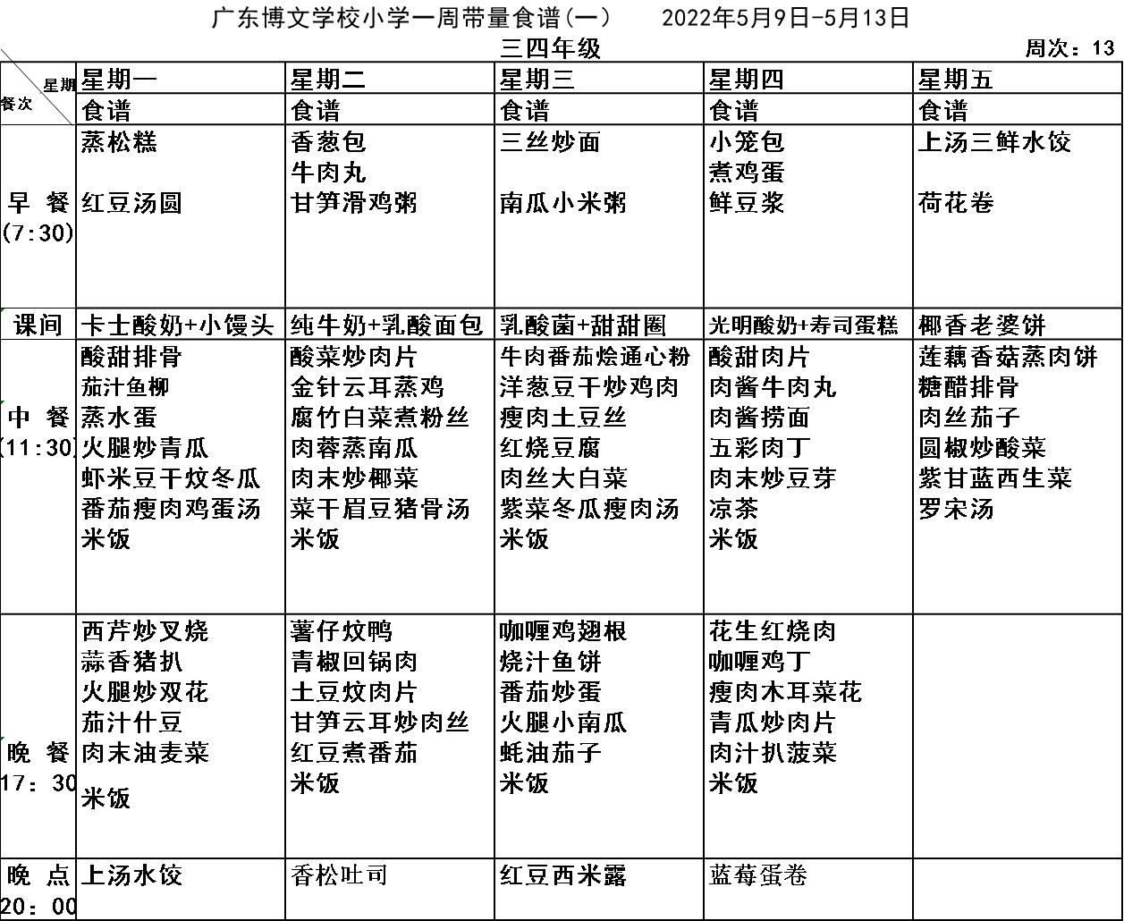 广东博文学校第十三周食谱公示