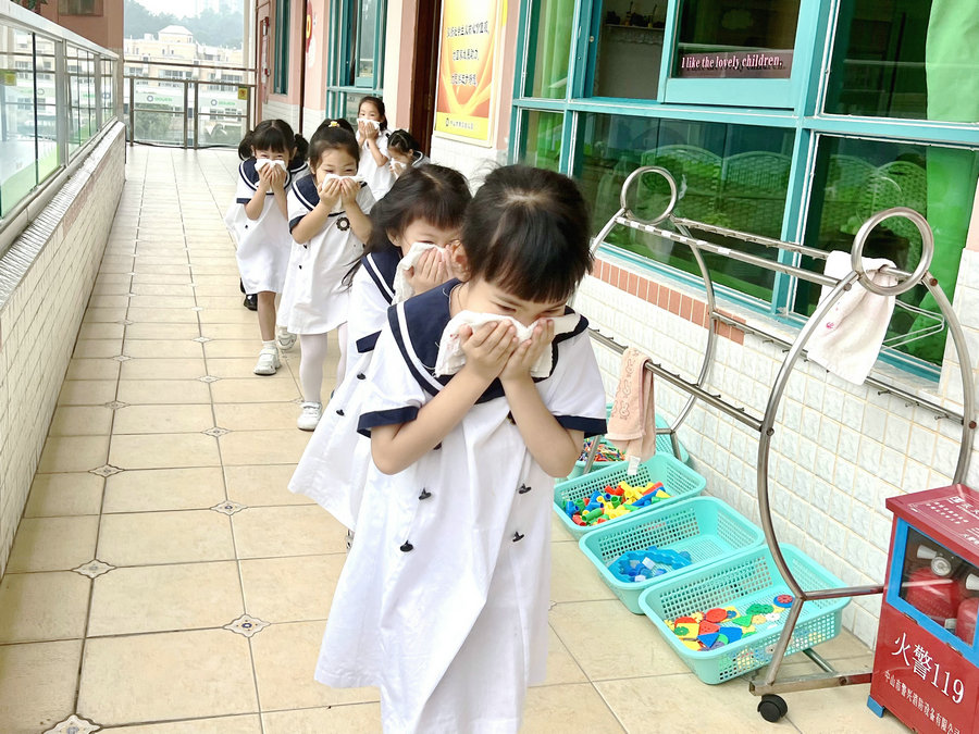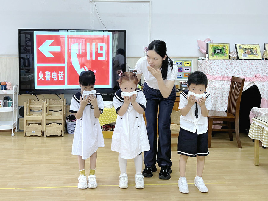 警报火警声响起,消防疏散演练开始了。全园师生听到指令“火”速行动,立即用湿毛巾捂着口鼻,用演练前规划的安全路线有序撤离,撤离中不抢道、不惊慌,老师们分工明确,到达操场后立即清点人数,并向园领导汇报撤离情况。