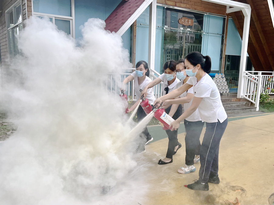 活动现场模拟了“初发火灾”场面,老师们亲自体验灭火器的使用,只见她们沉着冷静,上下颠倒摇晃几次,迅速拔下保险销,保持安全距离,左手扶喷管,喷嘴对准火焰根部,右手用力压下压把,灭火器随即喷出巨大的烟雾喷灭火源。通过活动,宝贝们直观、真实地了解了灭火器的使用方法,更深刻意识到消防安全的重要性,也让消防知识深入渗透进了宝贝们的生活中。