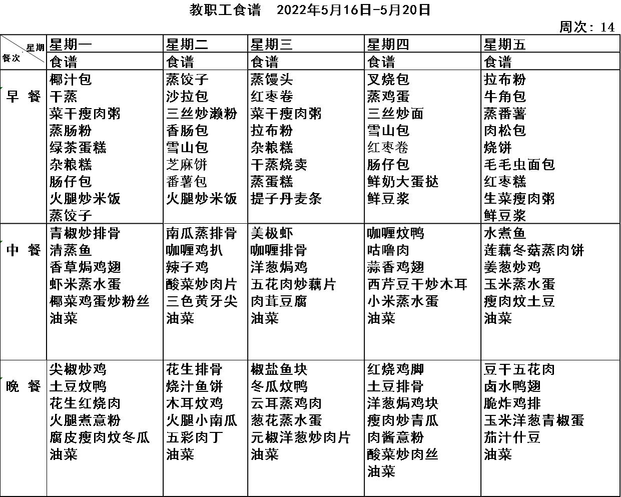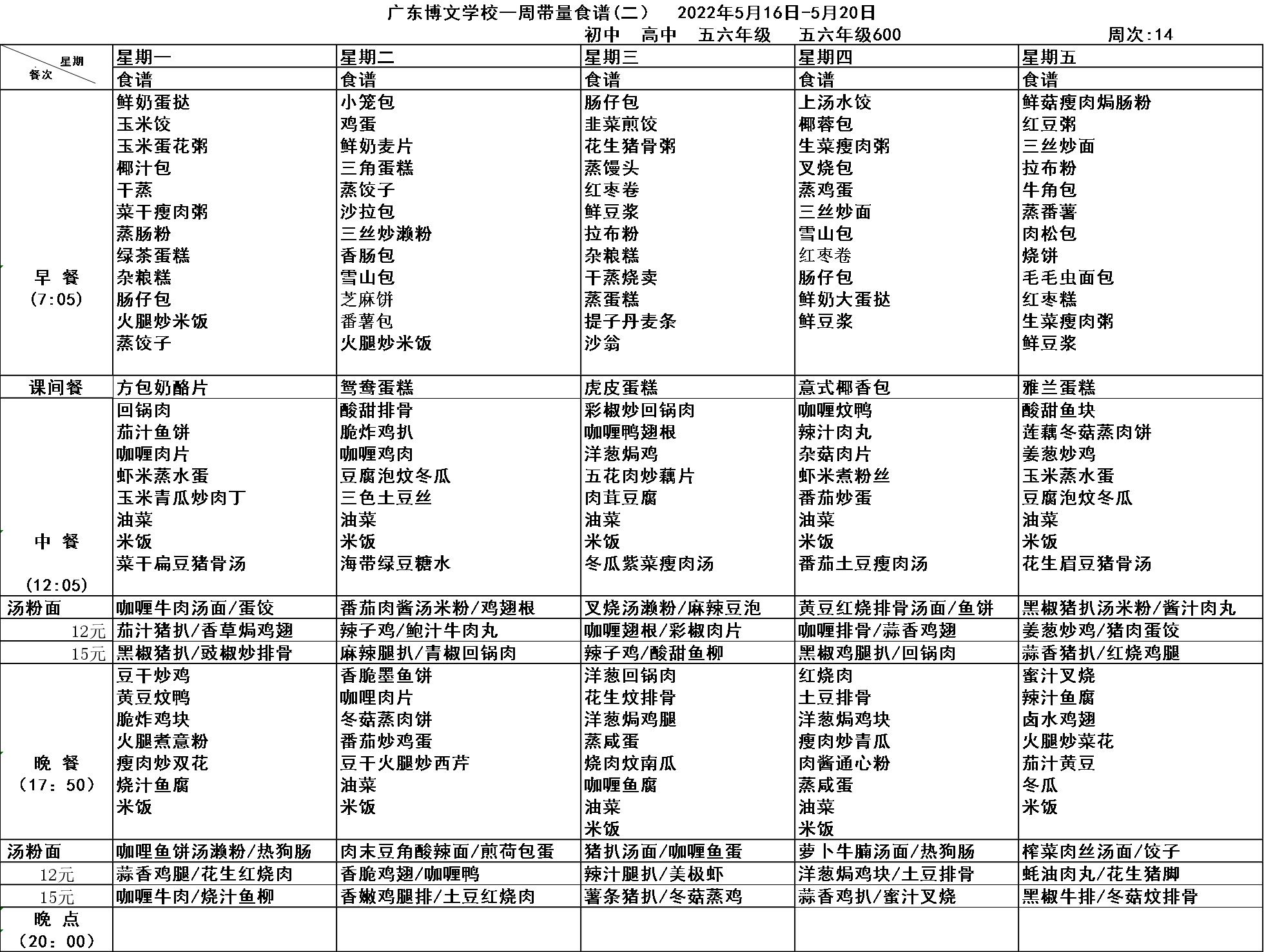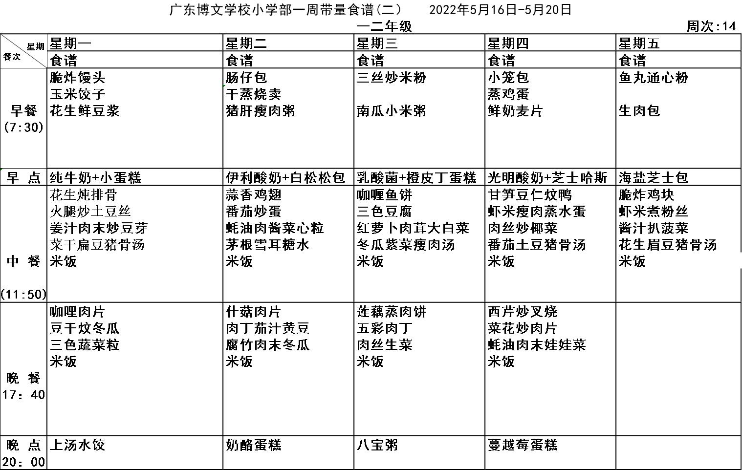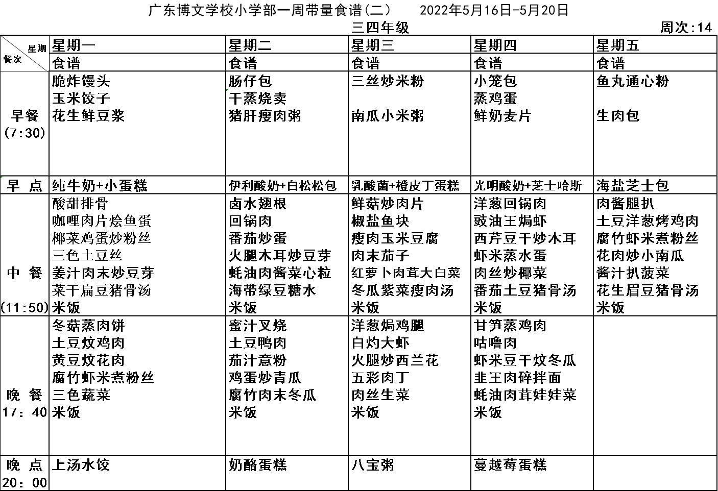 广东博文学校第十四周食谱公示