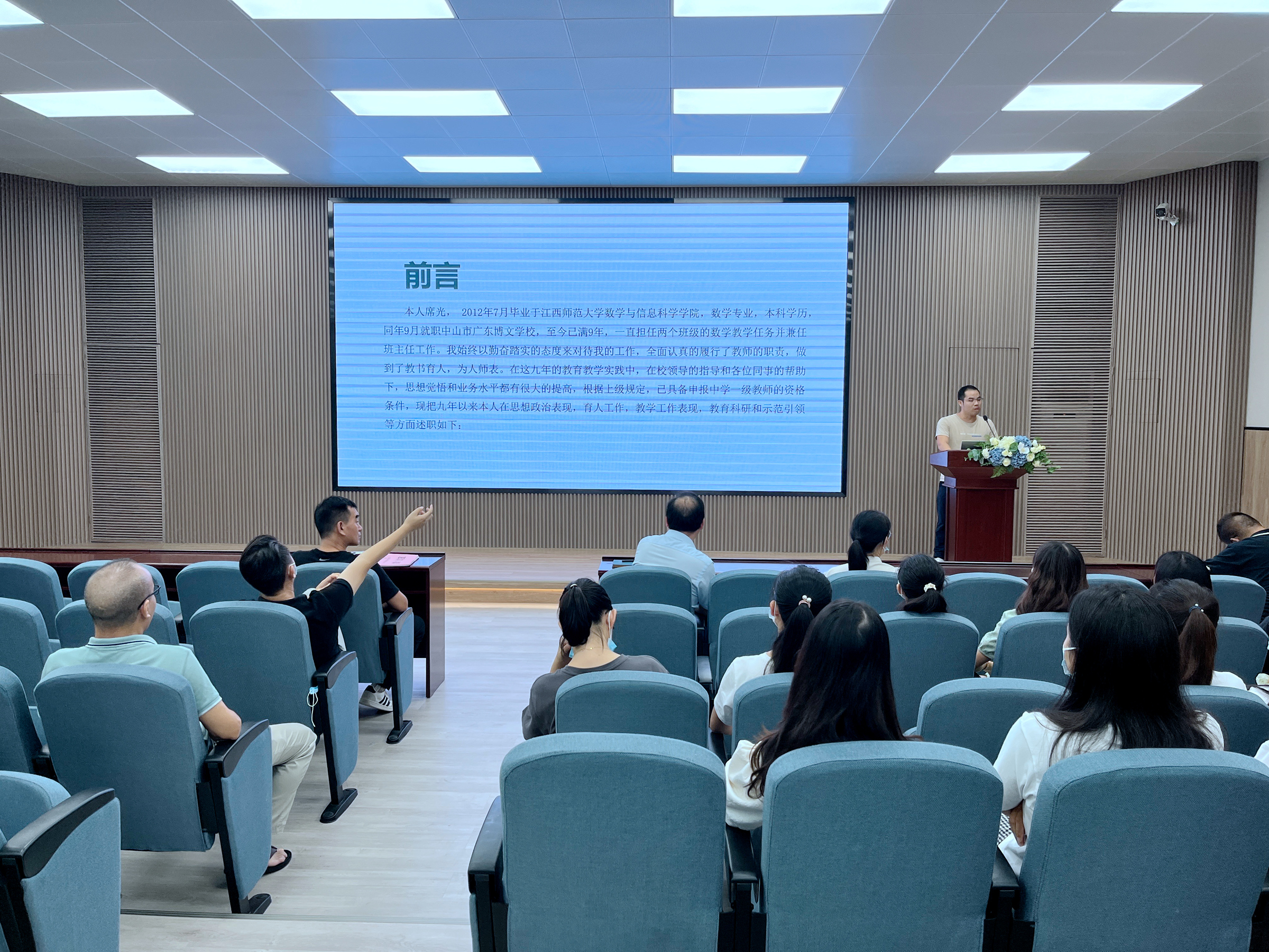初中部骨干教师席光就其思想政治表现、育人工作、教学工作表现,教育科研以及示范引领等方面进行述职,他用真挚的语言述说自己九年的教学历程,分享自己的成绩和收获,表达了不忘初心、不负使命的决心。