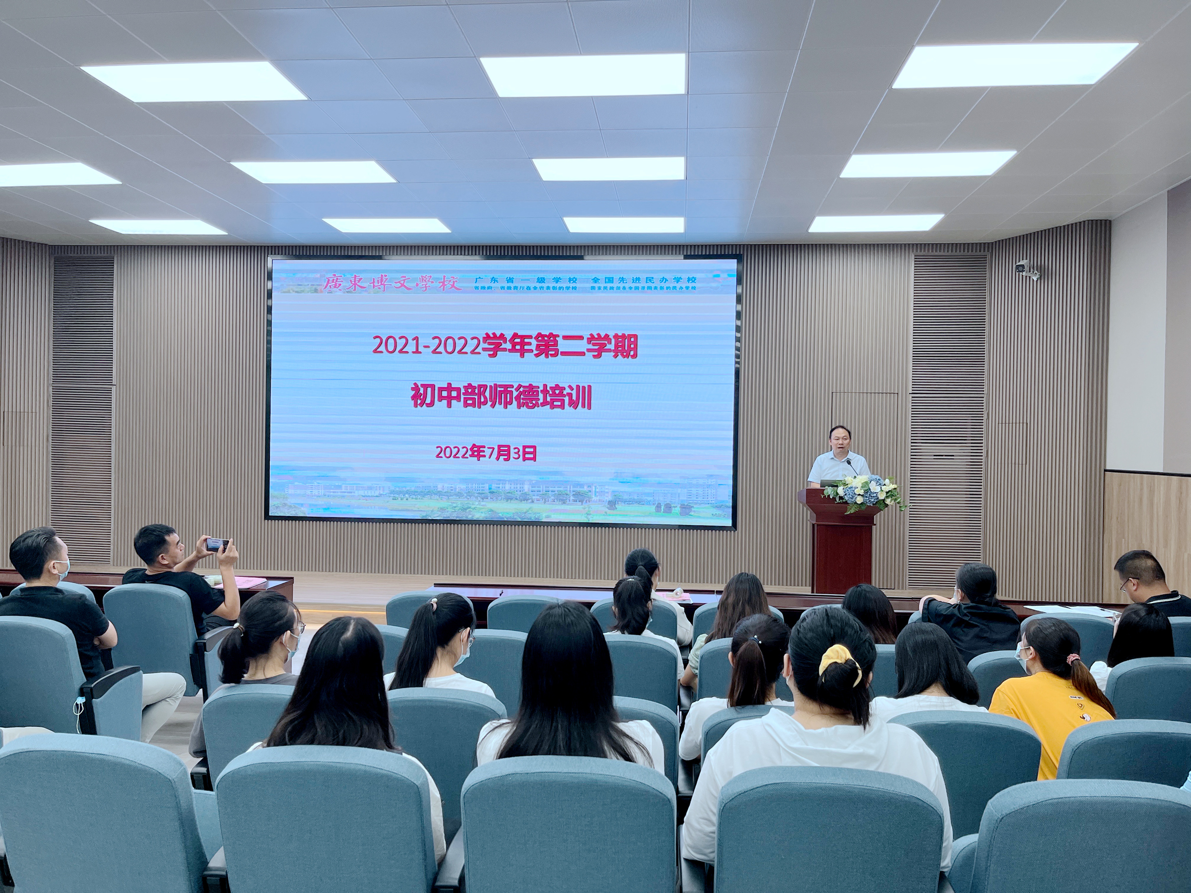 汤校长作暑假师德培训动员,传达上级有关文件精神,强调初中部全体教职工应不断提升政治站位,严守底线,真诚关心和关爱学生,以新时代“四有”教师的标准严格要求自己。