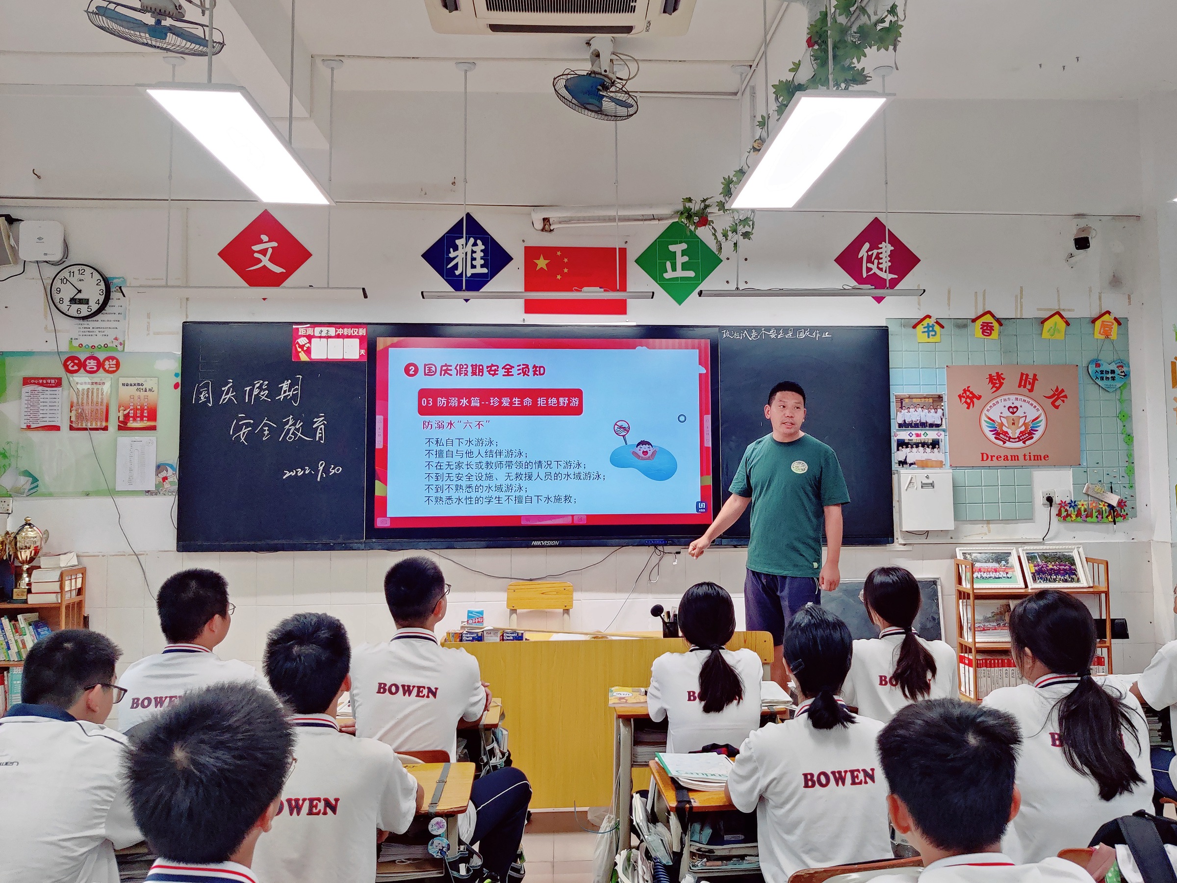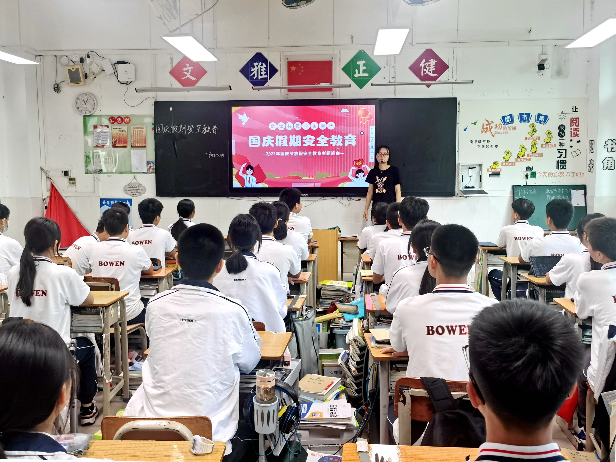 金秋送爽,稻谷飘香。国庆长假将至,疫情防控常态化依旧不能松懈,为进一步紧抓国庆假期的安全教育和疫情防控工作,进一步提高博文学校师生安全防范意识,确保师生生命安全和财产安全,9月30日,广东博文学校初中部各班召开了国庆假期安全主题班会。