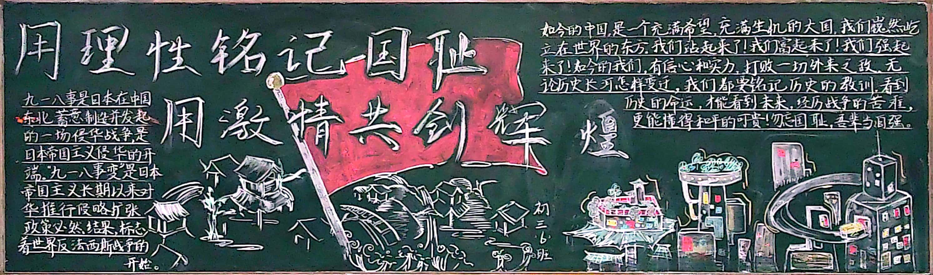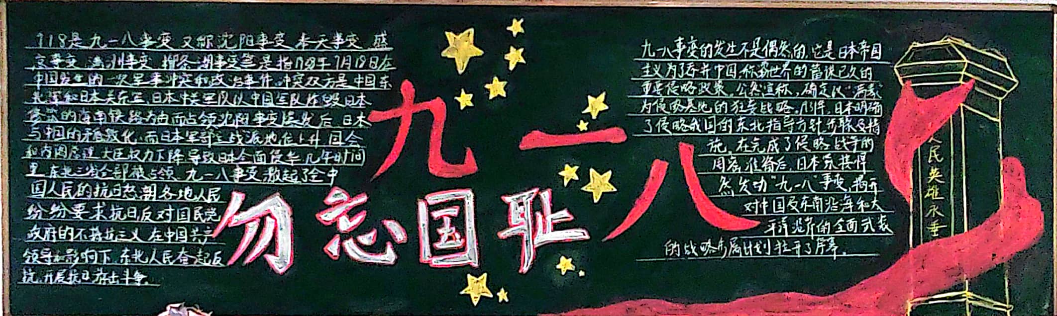 为弘扬先烈爱国之情、缅怀英烈报国之志,激发学生的爱国热情,厚植爱国主义情怀。在纪念“九一八事变”91周年之际,在学校党支部的领导下,校团委组织初中部开展了以“勿忘国耻,牢记九一八”为主题的黑板报评比活动。