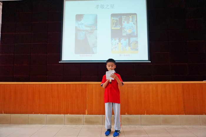 活动的第二项内容是分享孝心行动的心得体会。首先每个班先挑选一位“孝心天使”在集会上分享自己孝心行动的感受和体会,然后再放一些有关孝心的教育绘本给同学们观看,接着让同学们说说在家里是怎样孝敬父母的。