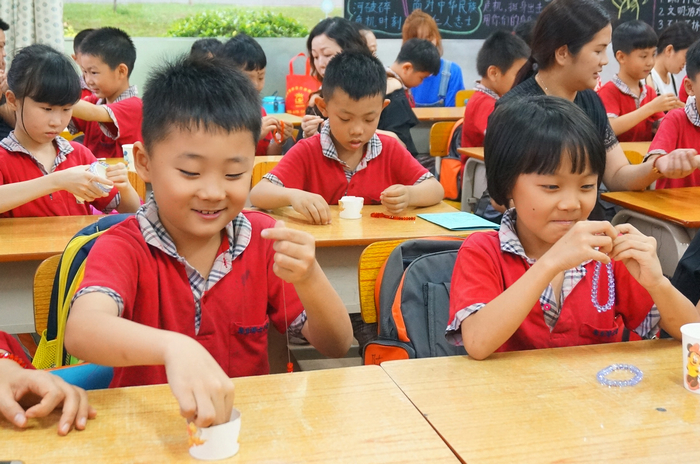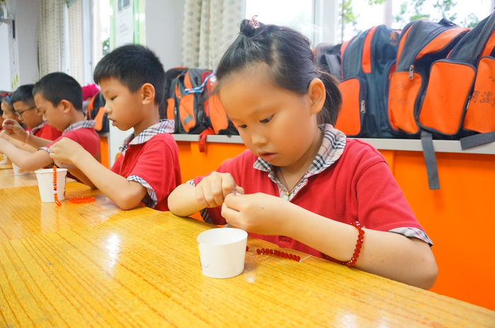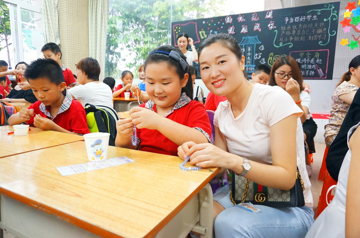 本次活动在温情的音乐声中开始,博文学子为母亲动情地唱起《感恩的心》,诵起《游子吟》。晶莹透亮的珠子闪烁着动人的光芒,孩子们拿起手中线,一颗一颗珠子仔细地串着,那专注的眼神和小心翼翼的模样感动着到场的每一位母亲。