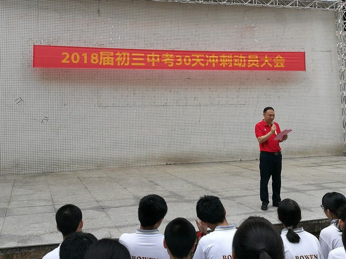大会开始,由学生代表李驿、周敬业同学率先发言,他们勉励在座的同学要摆正态度,用自己不懈地努力,奋战百日,迎战中考,慷慨激情的发言引发出同学们阵阵掌声。之后覃少华主任作为教师代表发言,他对初三全体学生在今后百天的复习备考提出了详细的要求,要求学生树立明确的目标、必胜的信心,制定学习计划,珍惜时间,调整心态,以坚强的意志迎战中考。接着汤勇校长下达动员令,希望学生要在正确的时间里做正确的事,并鼓励学生要相信自己,努力学习,顽强拼搏,以战无不胜的勇气,再创博文学校中考的辉煌。最后,全体初三班主任和初三年级各班先后进行了中考誓师,他们用铿锵有力的誓言,为最后30天的中考冲刺吹响了号角!至此,本次誓师大会圆满结束。
