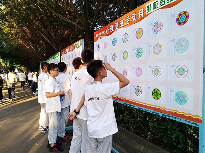 “曼陀罗”(梵语Mandala,即圆轮)原是佛教修行密法、观想的地域,被视为是佛陀觉悟境地,宇宙万物居住世界的缩图。心理学家荣格发现个体绘画曼陀罗,具有暗示其潜能和独特性的力量,曼陀罗:可以静心;可以疏导不良情绪;可以激活内在能量。 在初一年级举行曼陀罗绘画比赛,让学生认同自己、平静内心、激活自身内在正能量。初二年级的手抄报比赛侧重有效沟通方式的运用,让学生懂得语言的魅力,体会到语言的力量、语言的重要性,自觉运用文明用语、礼貌用语,能够恰当得体地与人有效沟通。初三年级,写给中考后自己的一封信,是配合中考30天冲刺宣誓。设想中考结束后,自己的状况、心情和希望。书信的目的是强化自己的誓言、为自己的奋斗目标描绘具体形象。此活动让学生对话自己的未来,强化自己的理想,具体自己的行动,规划自己的学习。为中考提供有效的坚定的心理支持。