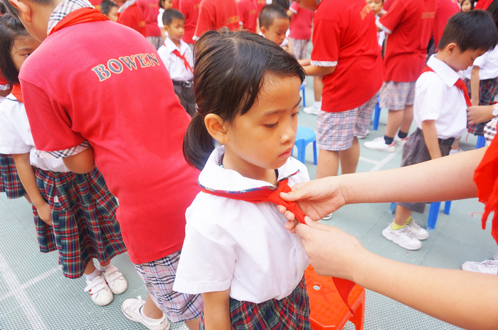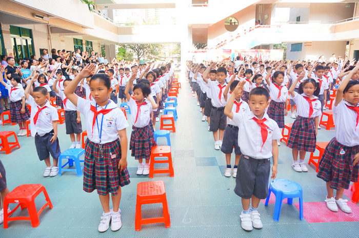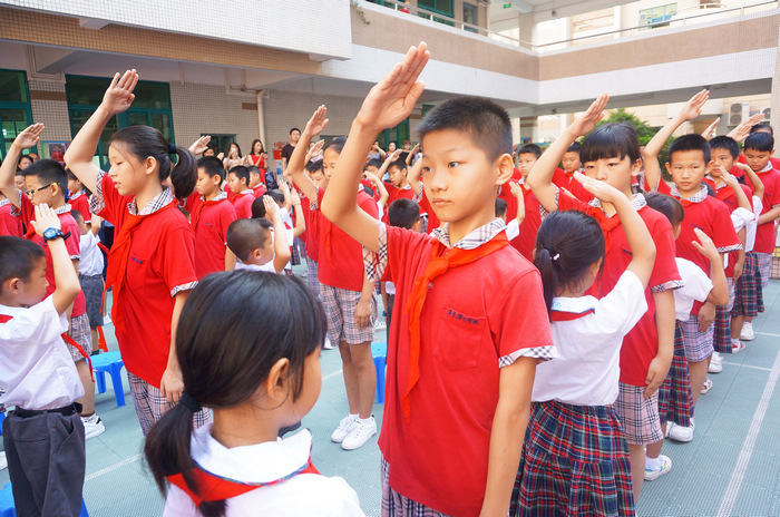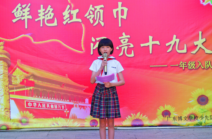 盛夏繁花似锦,六月青春明媚,6月1日上午,广东博文学校小学部举行了一场庄严的一年级新生入队仪式。一年级8个班,共310名新队员在火红队旗的见证下,光荣地加入了中国少年先锋队组织。