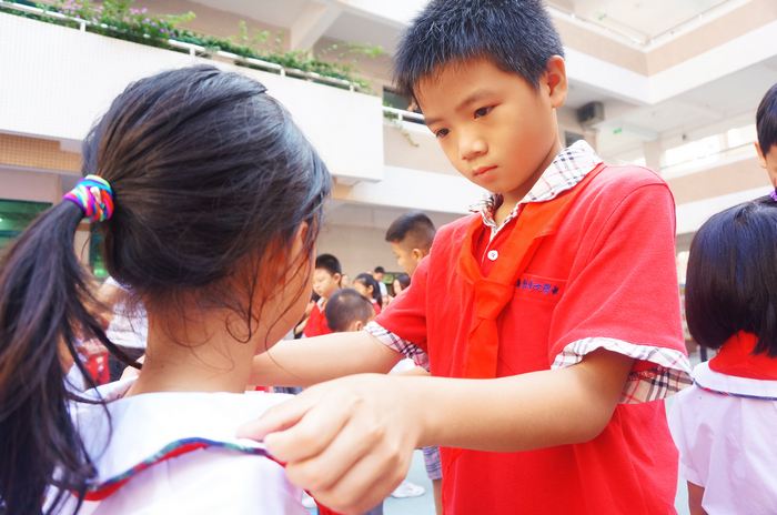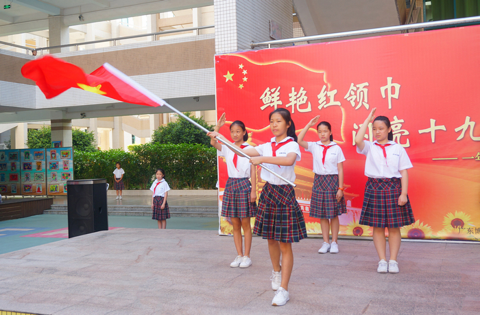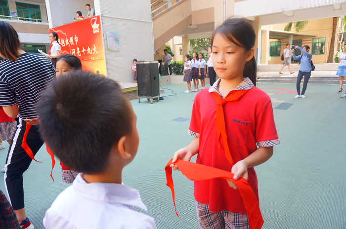 嘹亮铿锵的队歌响起,护旗手们迈着矫健的步伐,精神抖擞地走上星星舞台,入队仪式正式拉开了序幕。接着,四年级的老队员们为新队员们戴上了鲜艳的红领巾,明媚的阳光照耀着小朋友们自信的面庞,他们举起右拳,庄严宣誓;他们面向师长,庄严敬礼。随后,少先队代表发言,表达了自己将以严格标准规范自己的积极信念,牢记使命的坚定决心。最后在大队辅导员蔡老师的带领下,少先队员们大声呼号:时刻准备着,嘹亮自信的声音响彻整个校园。