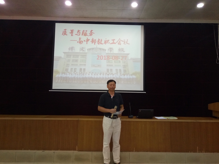 接下来任校对2018-2019上学期工作要求及学校奖惩文件进行了解读,明确了新学期工作的总体思路,他要求新学期要用创新思维来推进学校教育教学质量的进一步提高,从提高教学精准性入手提高课堂教学的有效性;要用科学的治理机制、评价方式来引领学校发展,突出各项工作管理的规范性、实效性,并希望全体教师以饱满的工作状态迎接新挑战,再创新辉煌。