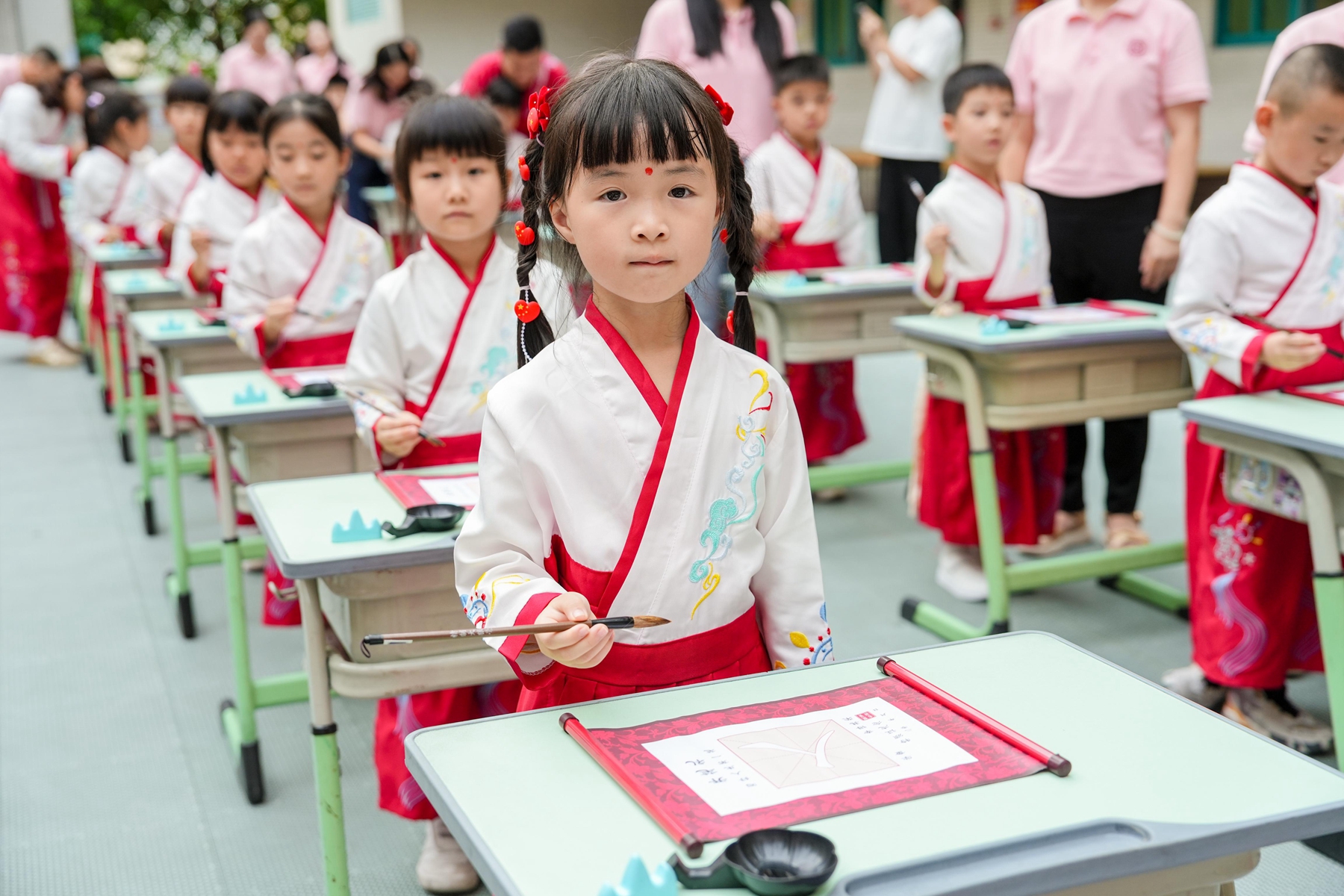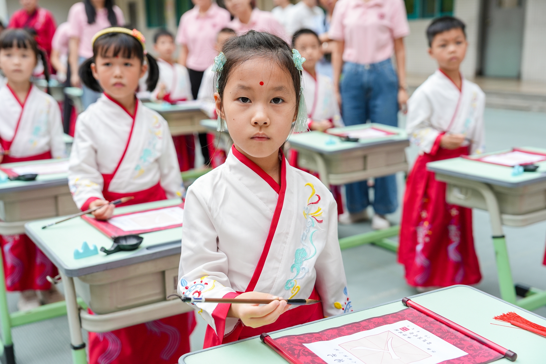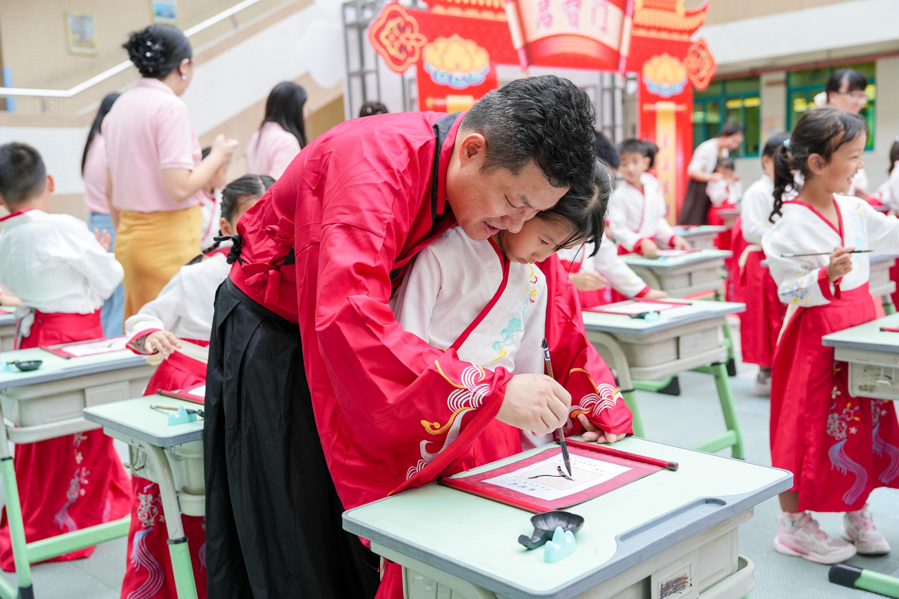 “击鼓鸣志”环节,清脆的鼓声回荡校园,每一声都承载着学子们对未来的期许;随后,师长们手持朱砂,在新生额头轻点“痣”,寓意开启智慧、点亮心灯。在书法老师的指导下,学子们手握毛笔,由启蒙老师手把着手,一笔一划书写“人”字,在墨香中领悟做人的道理。