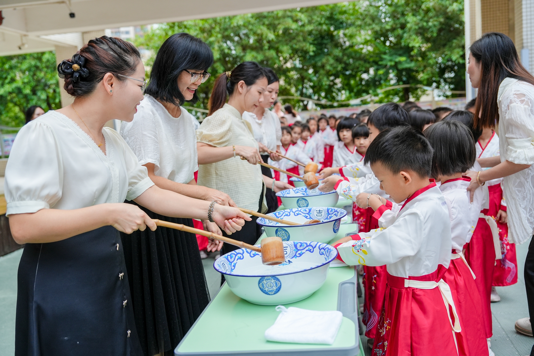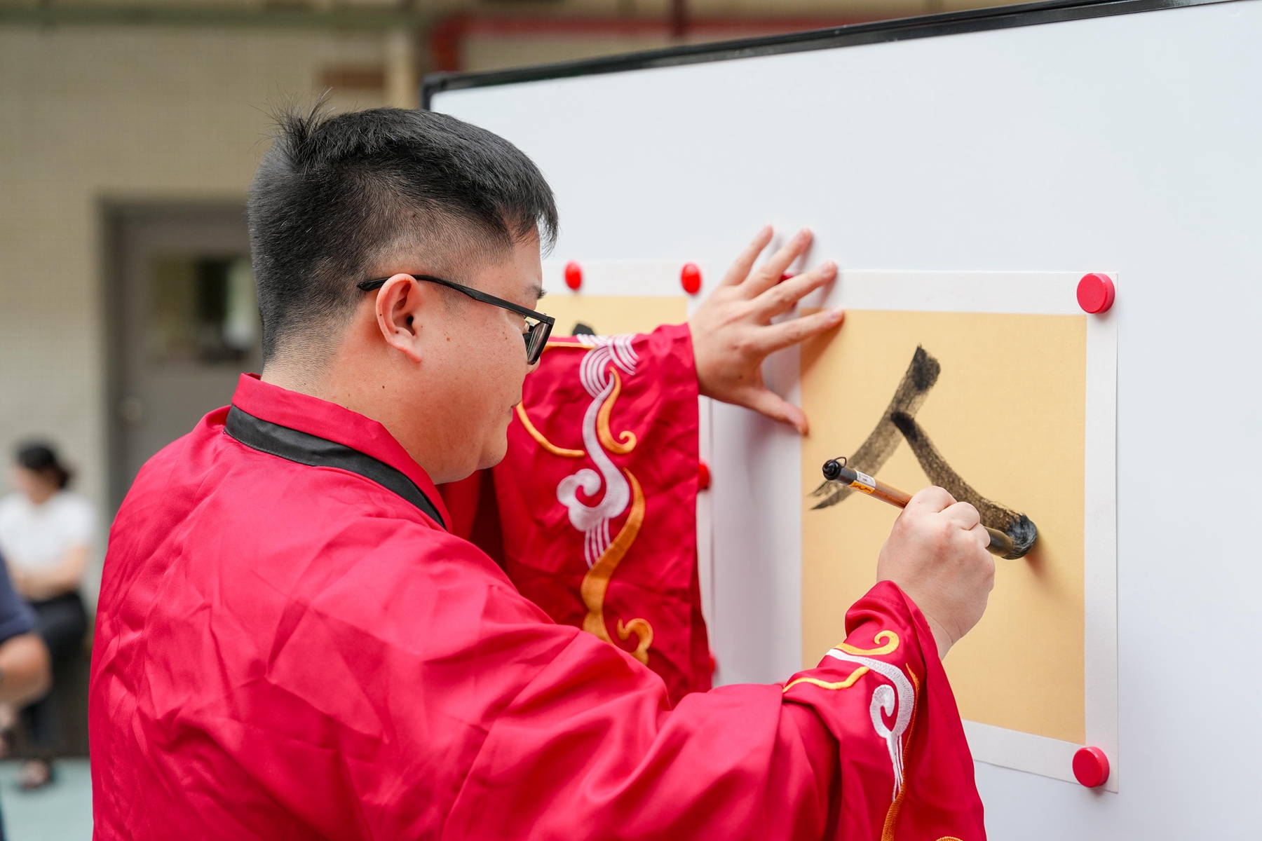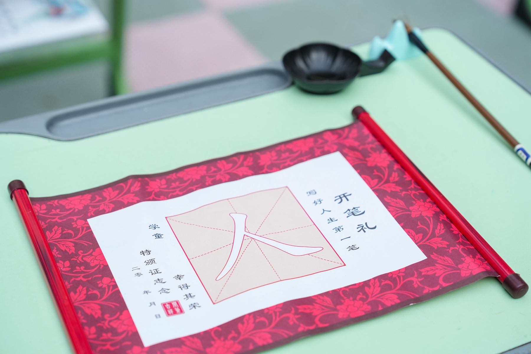 “击鼓鸣志”环节,清脆的鼓声回荡校园,每一声都承载着学子们对未来的期许;随后,师长们手持朱砂,在新生额头轻点“痣”,寓意开启智慧、点亮心灯。在书法老师的指导下,学子们手握毛笔,由启蒙老师手把着手,一笔一划书写“人”字,在墨香中领悟做人的道理。