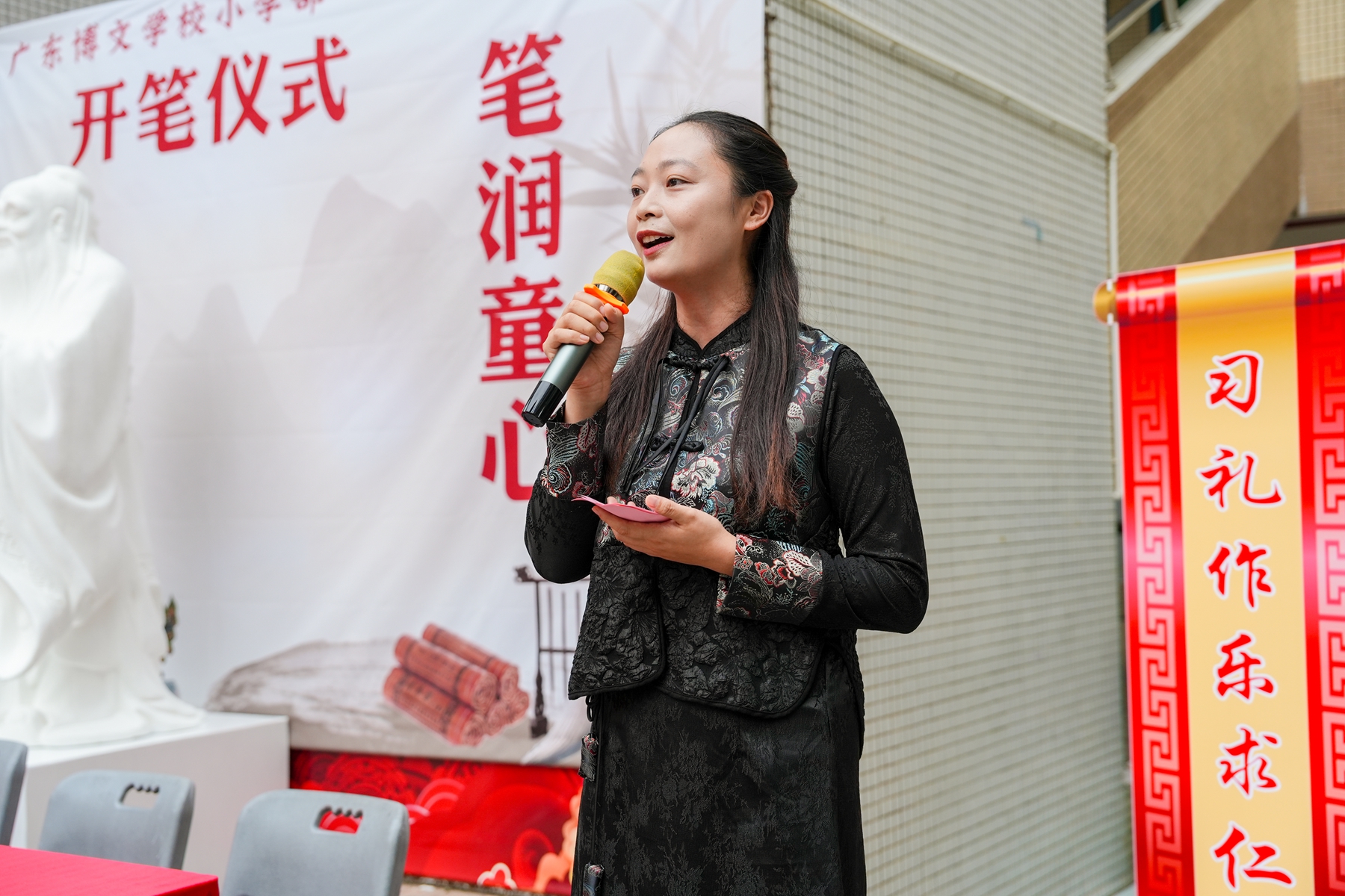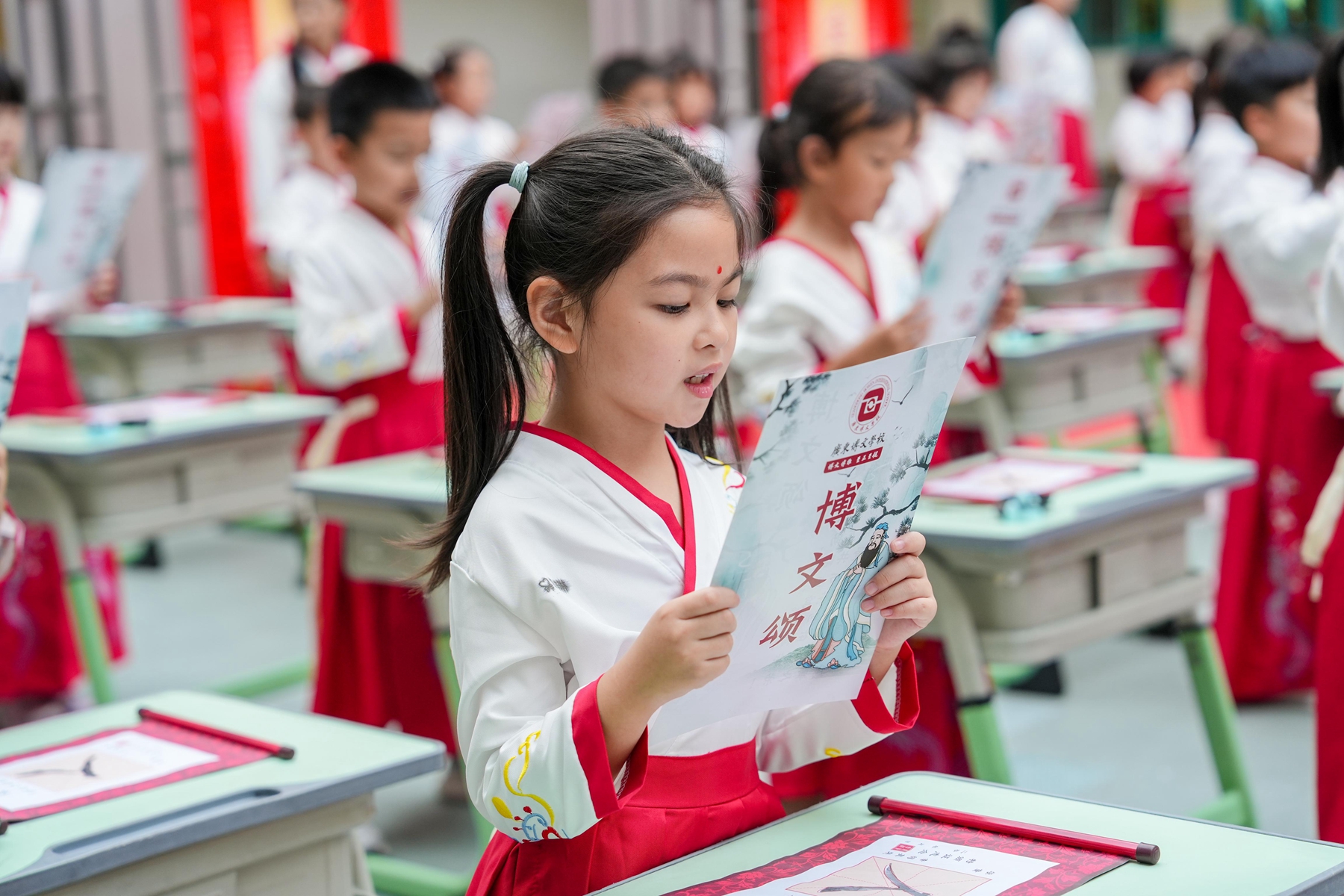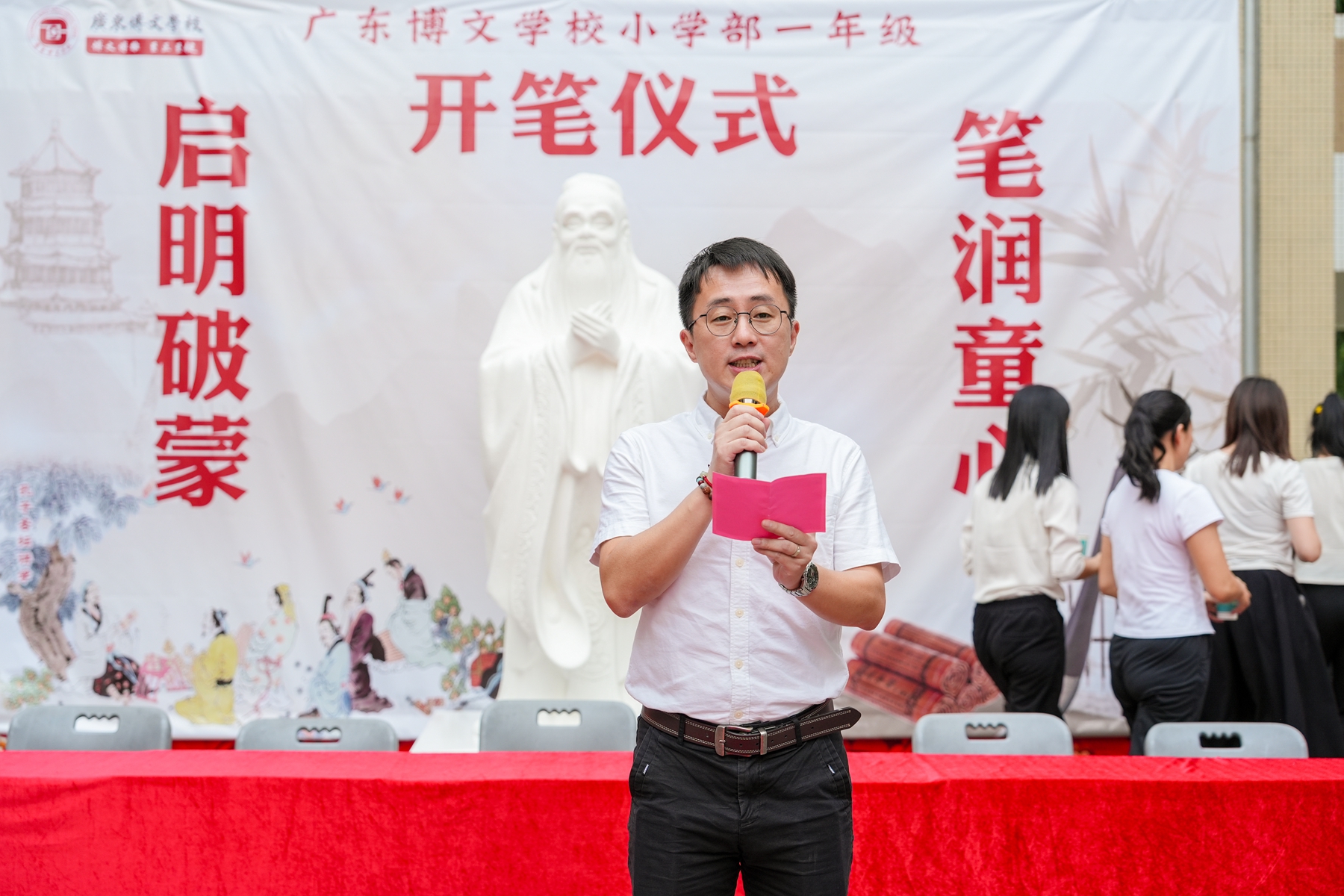 仪式尾声,家长代表发言,字里行间满是对孩子的期盼与嘱托。最终,全体师生齐诵《博文颂》,“博文博雅,至正至健……”朗朗书声浸润校园,为这场充满文化底蕴的开笔礼画上圆满句号。