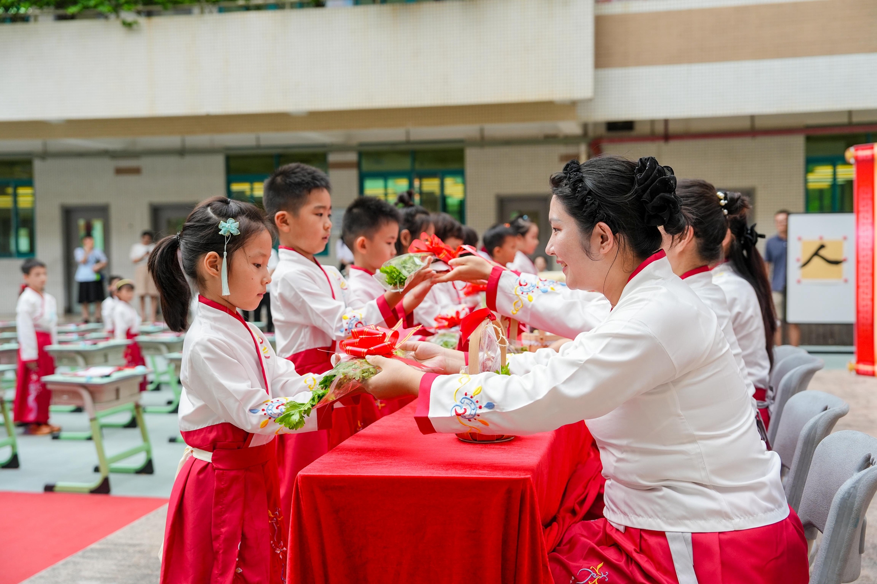 “正衣冠,明事理”,在老师们的带领下,新生们肃穆整理衣冠,领悟“先正衣冠,后明事理”的古训;“告天礼”与“拜孔礼”环节,学子们肃立行礼,心怀对知识的敬畏与对先贤的尊崇;“拜师礼”上,新生向师长行拜师之礼,师长回赠葱、芹菜、红枣,象征担下“传道、授业、解惑”的重大责任。孩子们交托了信任和真诚,老师们接过了使命和担当,薪火相传的师生情谊在此刻凝聚。