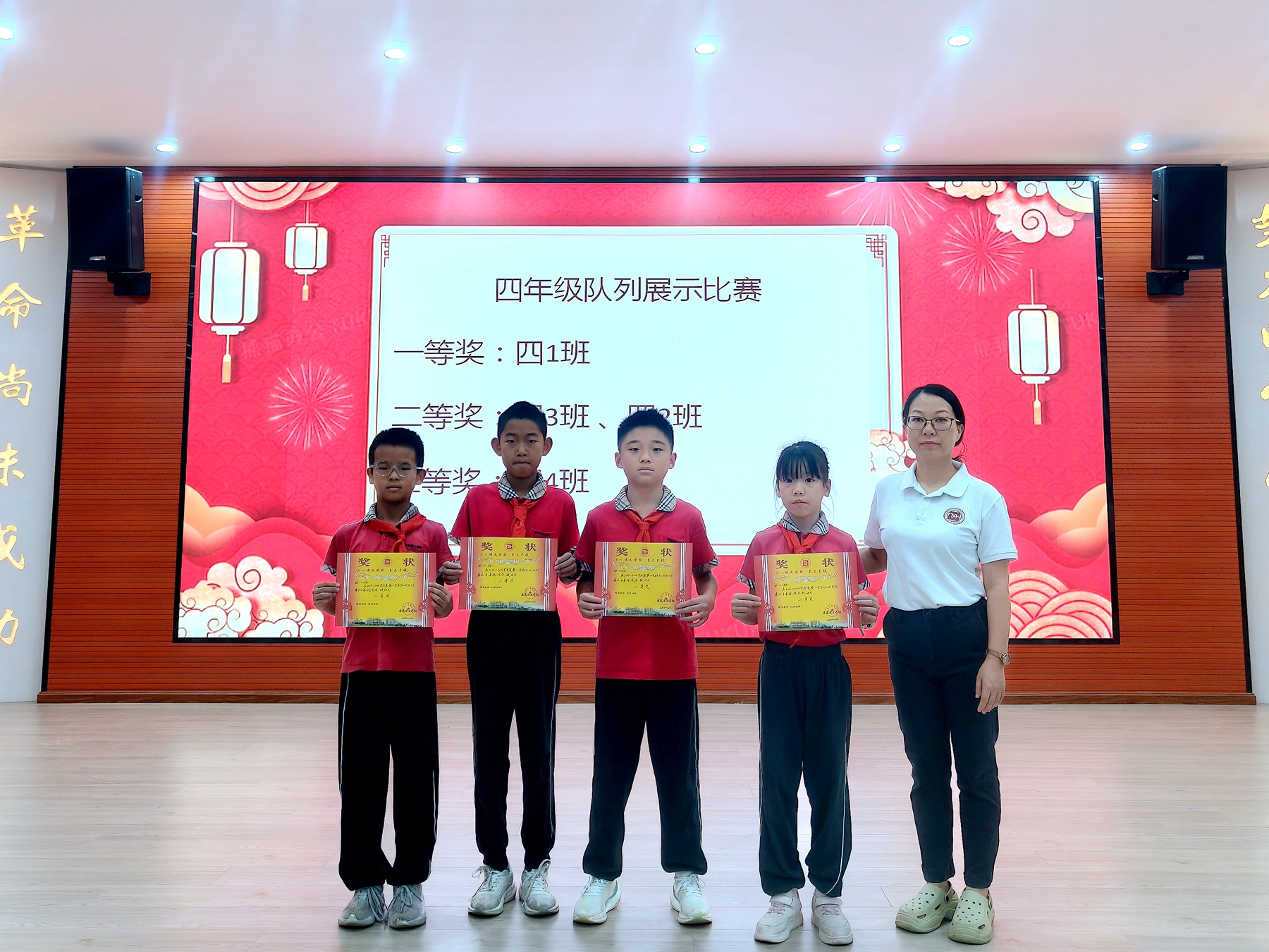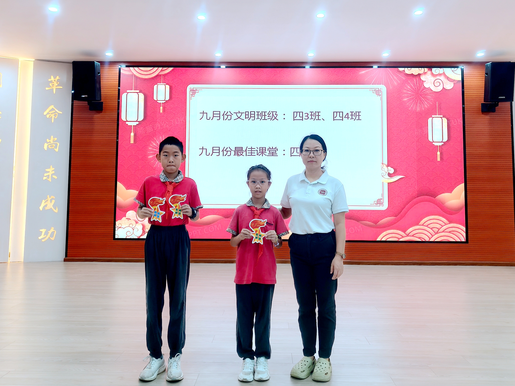 随后,大会为在“四年级队列展示比赛”中获奖的班级颁奖。获奖班级步伐整齐、口号响亮,展现了良好的精神风貌和集体荣誉感。最后,大会表彰了获得“九月份文明班级”和“最佳课堂”荣誉的集体。这些班级在环境卫生、课堂纪律、文明礼仪等方面表现卓越,尤其是在保持“入室即静,入座即学”的良好氛围上成效显著。