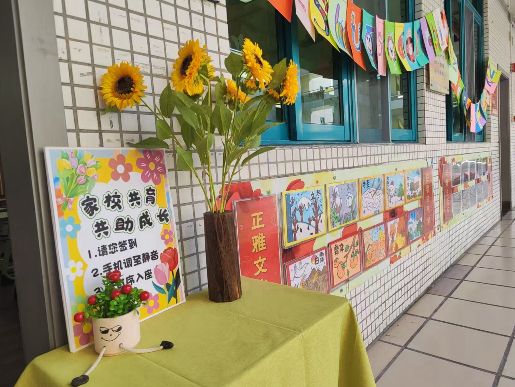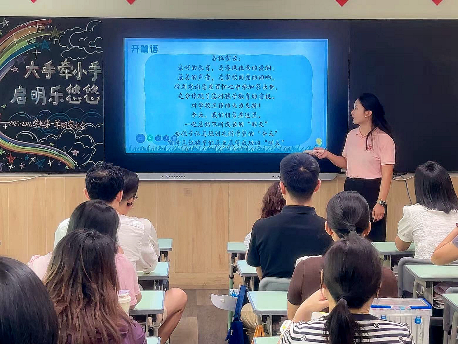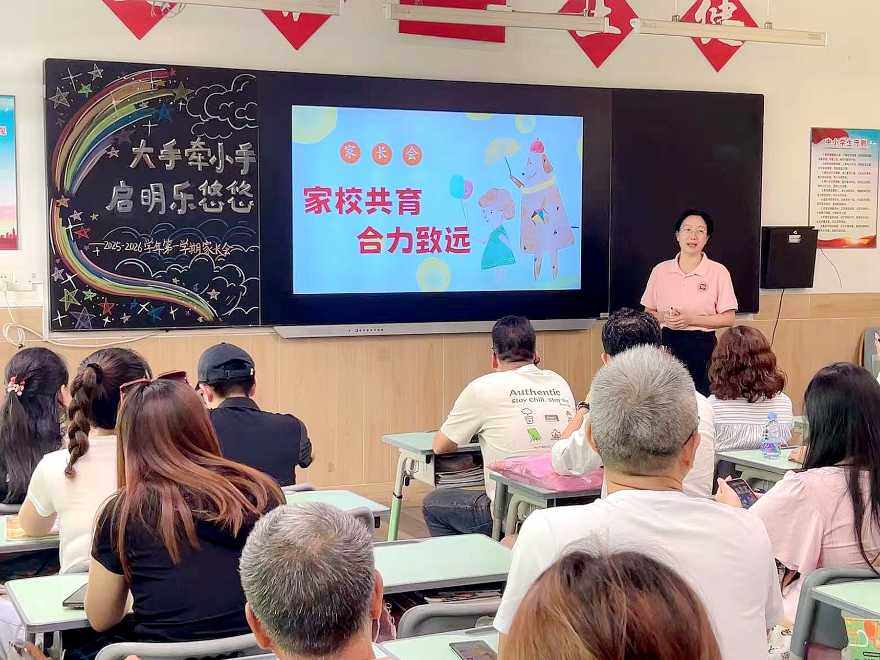 活动筹备阶段,各班级已洋溢着温馨氛围:老师们提前将教室打扫得窗明几净,桌椅排列得井然有序,黑板上用彩色粉笔精心书写的 “大手牵小手,启明乐悠悠” 主题标语格外醒目;门口的签到台不仅备好纸笔与瓶装水,更以细致周到的安排,让家长们刚踏入校园便感受到学校的满满诚意与教育温度。