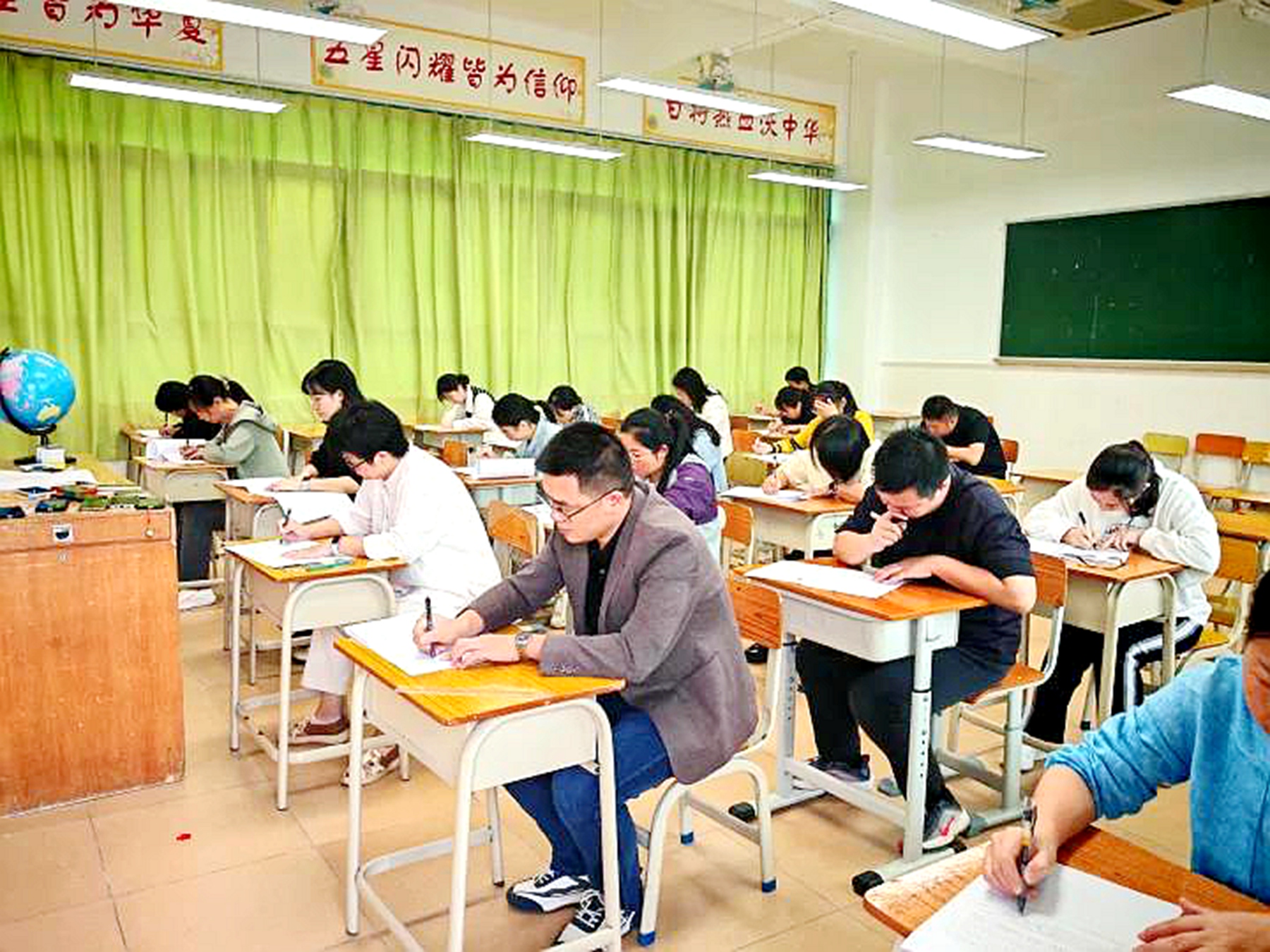 比赛严格参照中考命题标准与题型结构,覆盖语文、数学、英语、物理、化学、历史、道法等全学科。考场上,老师们褪去讲台的从容,以“考生”身份全神贯注投入答题:时而凝神思索数学压轴题的解题思路,时而细致推敲语文阅读理解的答题要点,时而精准演算物理化学的实验数据,沙沙书写声中,尽显对学科知识的深刻把握与严谨治学态度。