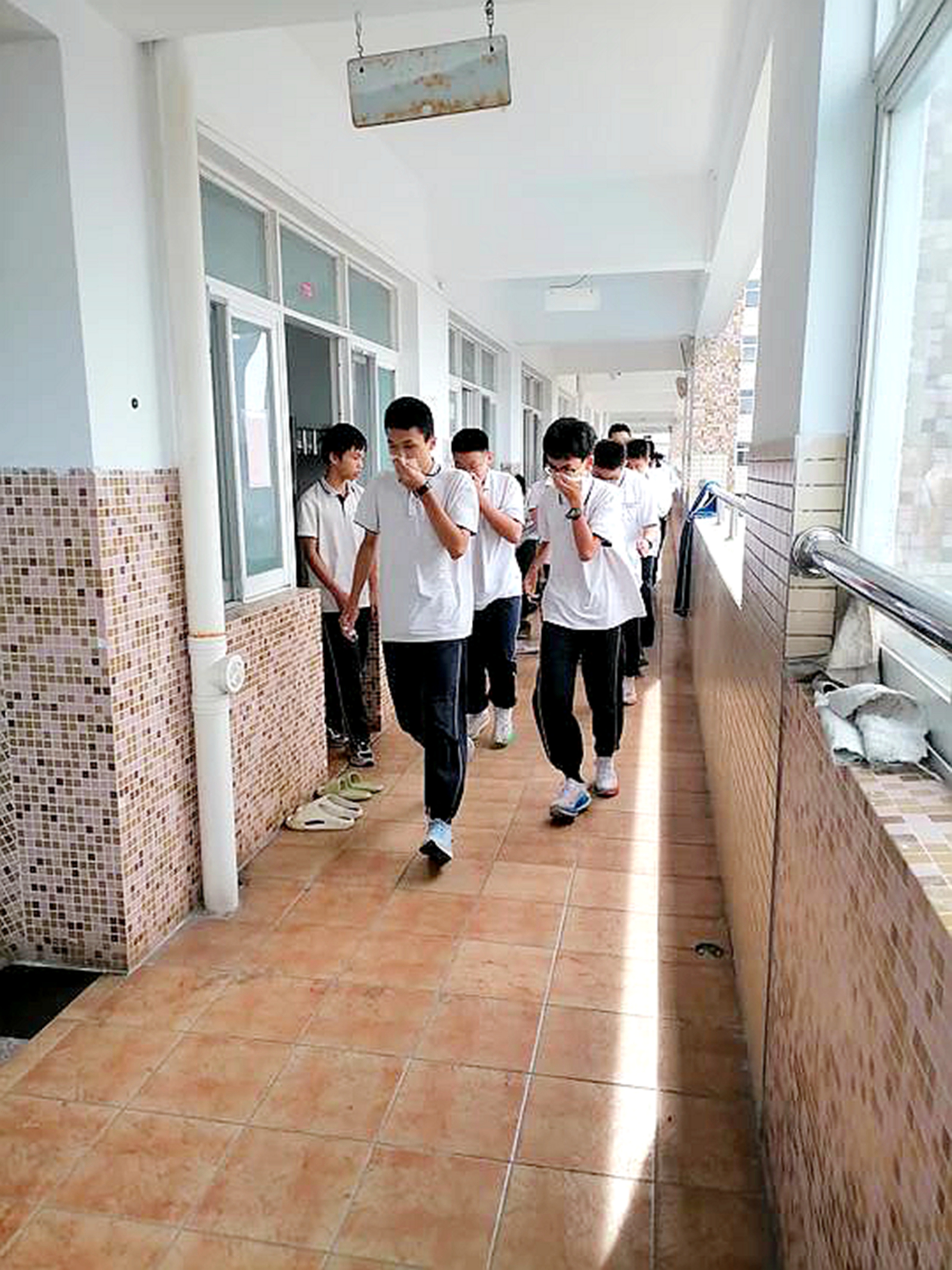 随着哨声响起,同学们用湿毛巾捂住口鼻,弯腰低姿前进,迅速有序地按照预定路线撤离。各楼层负责老师及时疏导人流,确保通道畅通。到达指定集合区域后,各班迅速整队,班长协助班主任清点人数,并及时上报。