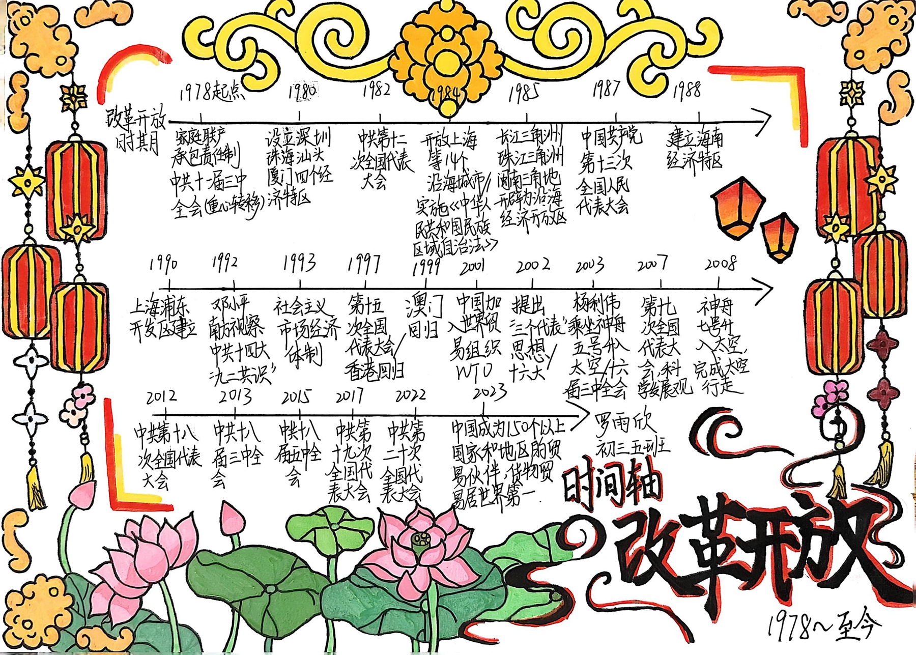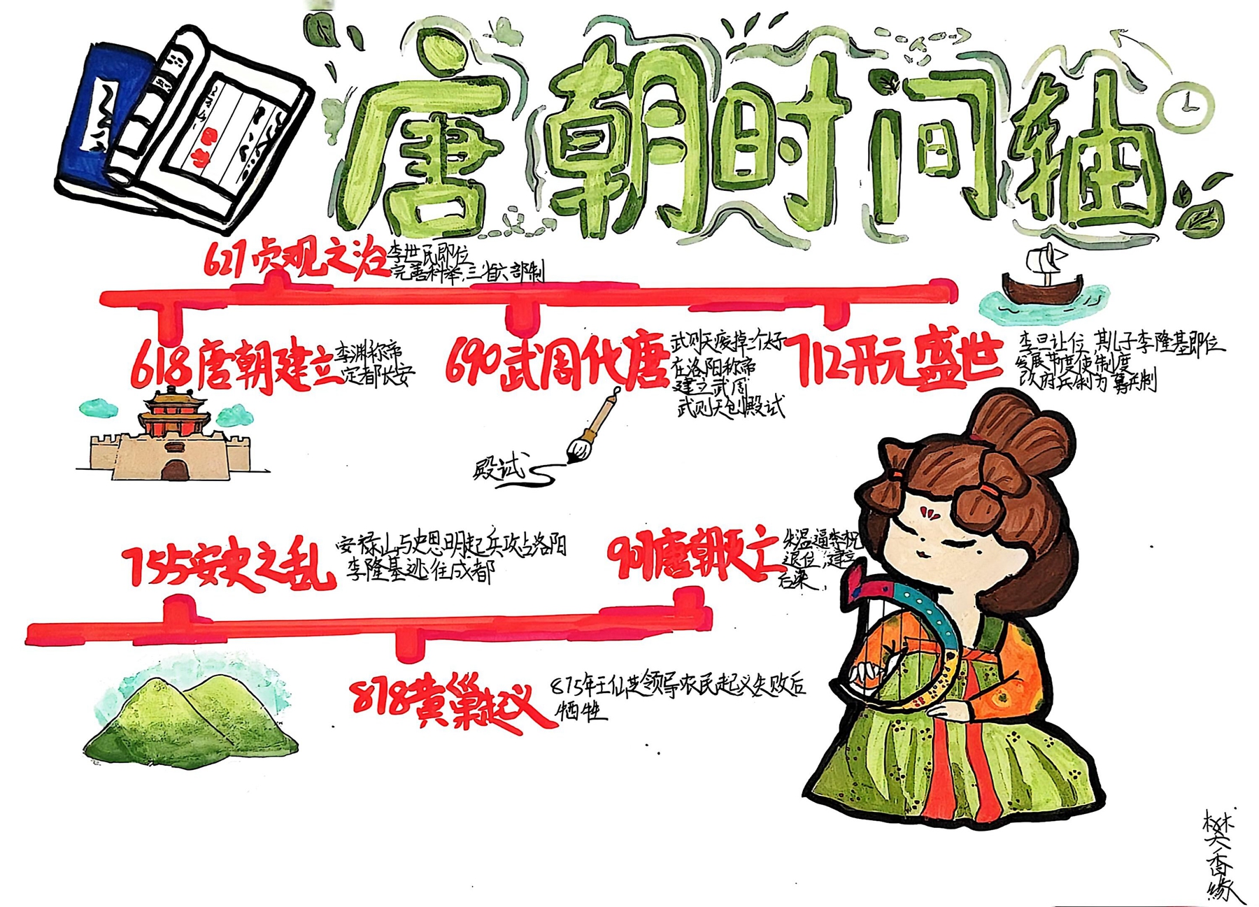 开学后,历史科组从“时空准确性、关联逻辑性、创意表现力”三大维度遴选优秀作品。展览现场,一幅幅创意时间轴宛如立体“历史思维图谱”,吸引同学们驻足研讨。“原来唐诗繁荣与科举制完善竟在同一时期”“顺着时间轴梳理,才懂近代先辈救亡图存的家国担当”,同学们的感慨,正是创意实践带来的思维突破与情感共鸣。