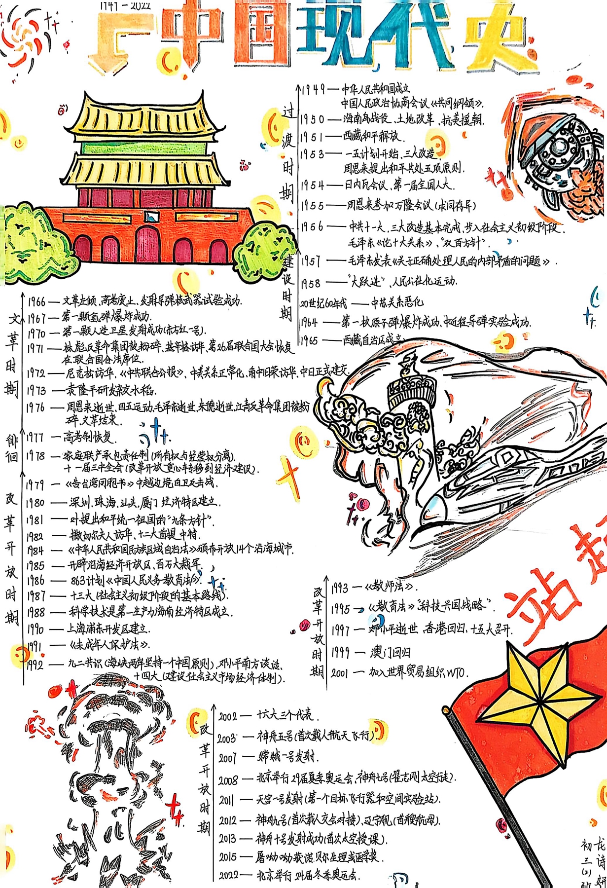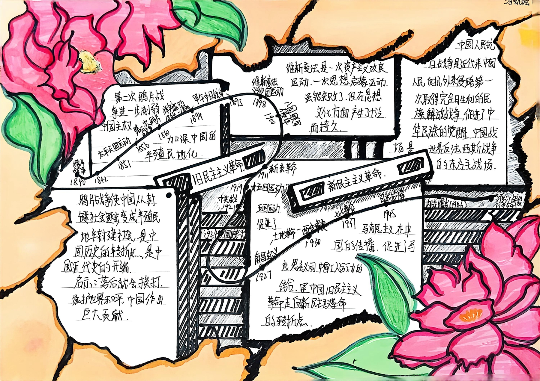 活动紧扣课题核心,打破“单点记忆”的传统学习模式,引导学生主动“关联建构”。同学们以课题理念为指引,依托教材、查阅史料,化身“时空架构师”:或串联夏商制度、秦汉一统至明清转型的纵向脉络,标注事件因果传承;或以“家国发展”为线索,关联近代抗争、新中国建设等片段,展现时代逻辑。大家巧用思维导图、因果箭头等方式,将零散知识点转化为系统时空框架,让隐性关联直观可感。