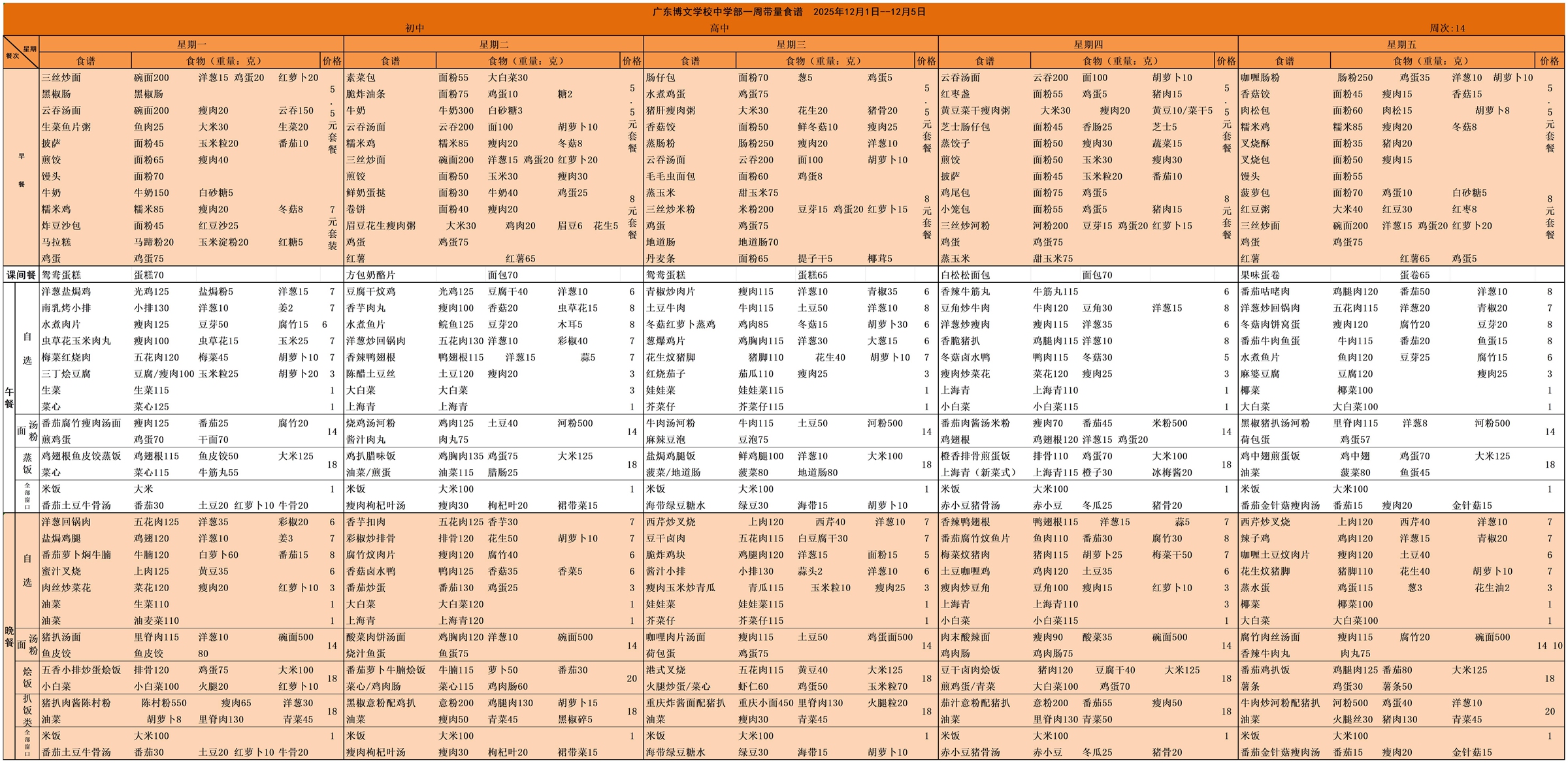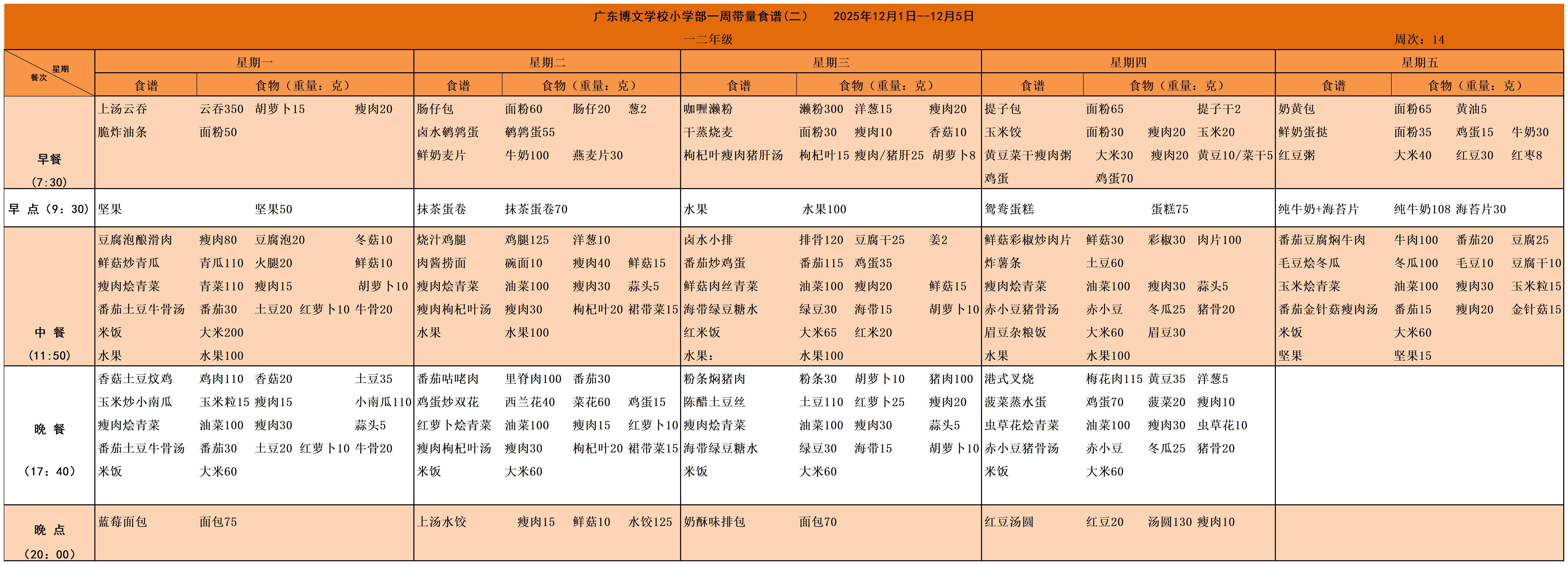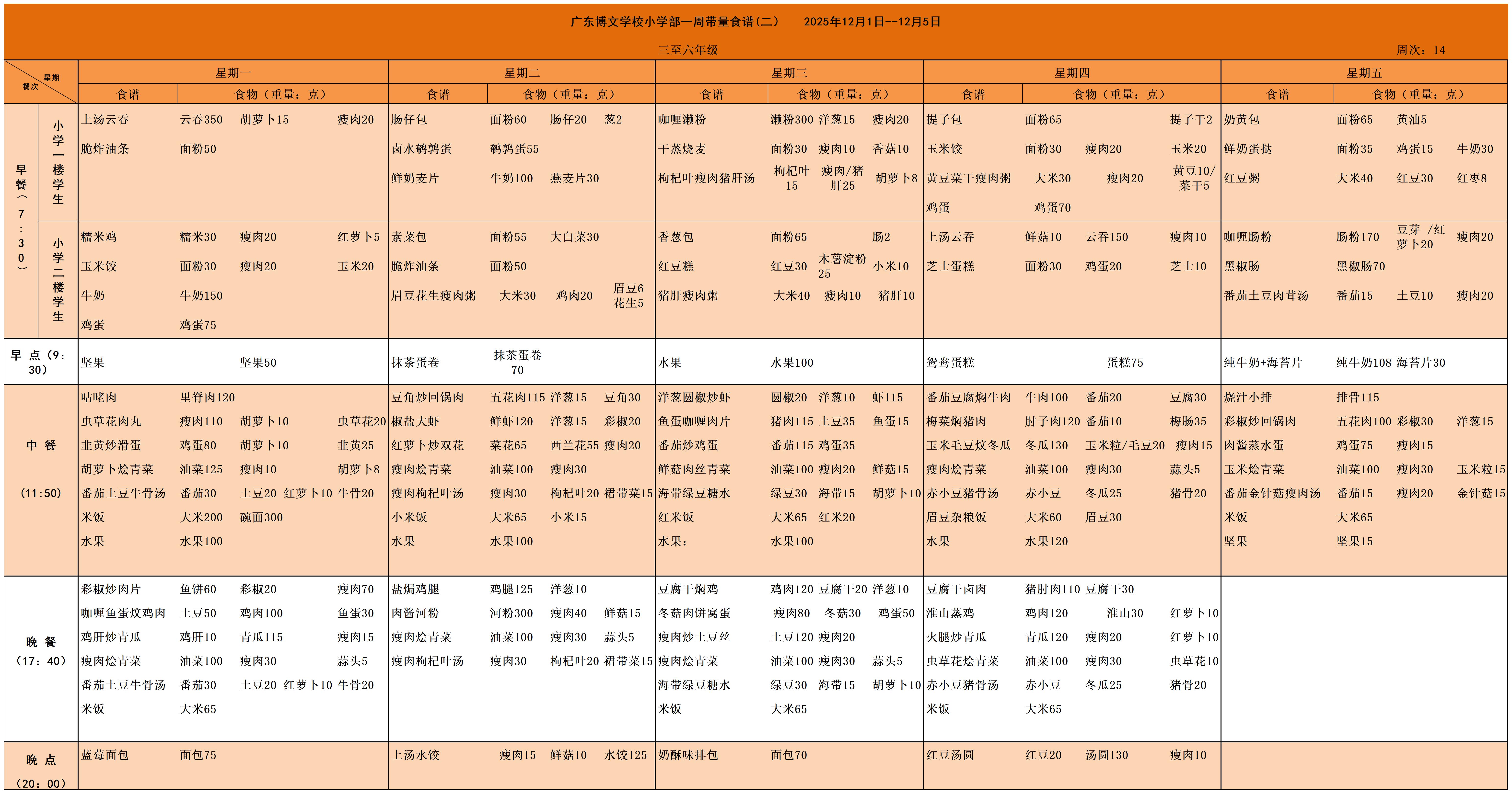 广东博文学校2025年秋季学期第十四周食谱公示