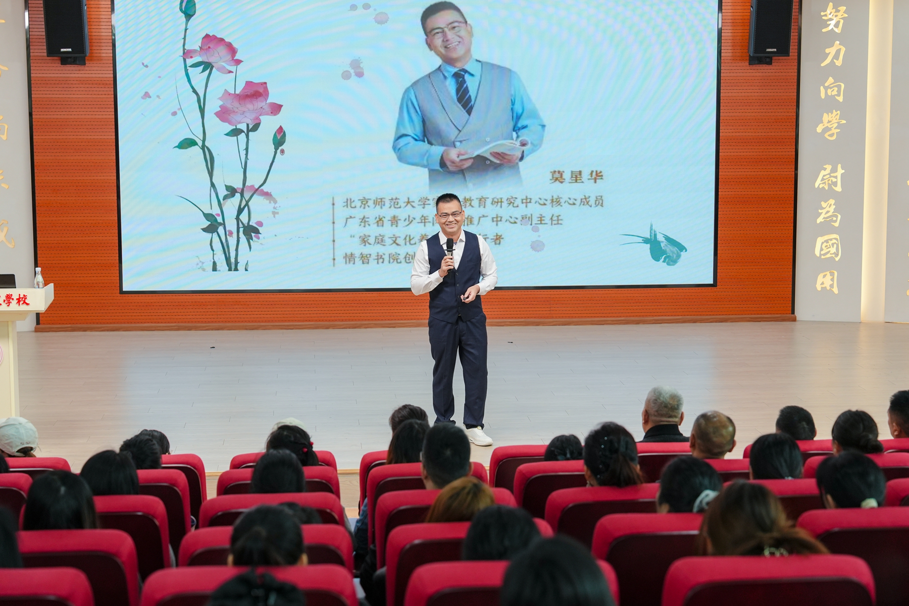 活动伊始,《从阅读到悦读》公益讲座温情启幕。广东省青少年阅读推广中心副主任莫星华老师受邀主讲,他从“如何帮孩子爱上阅读”切入,倡导家长打造成长型家庭阅读环境,通过控制电子产品使用、搭建家庭书房、走进图书馆等方式培育阅读氛围;同时分享科学选书、慢读细品、联想共读等实用方法,指导家长带领孩子实现深度阅读。整场讲座干货满满,家长们专注聆听、认真记录,纷纷表示对家庭阅读指导有了更清晰的方向。
