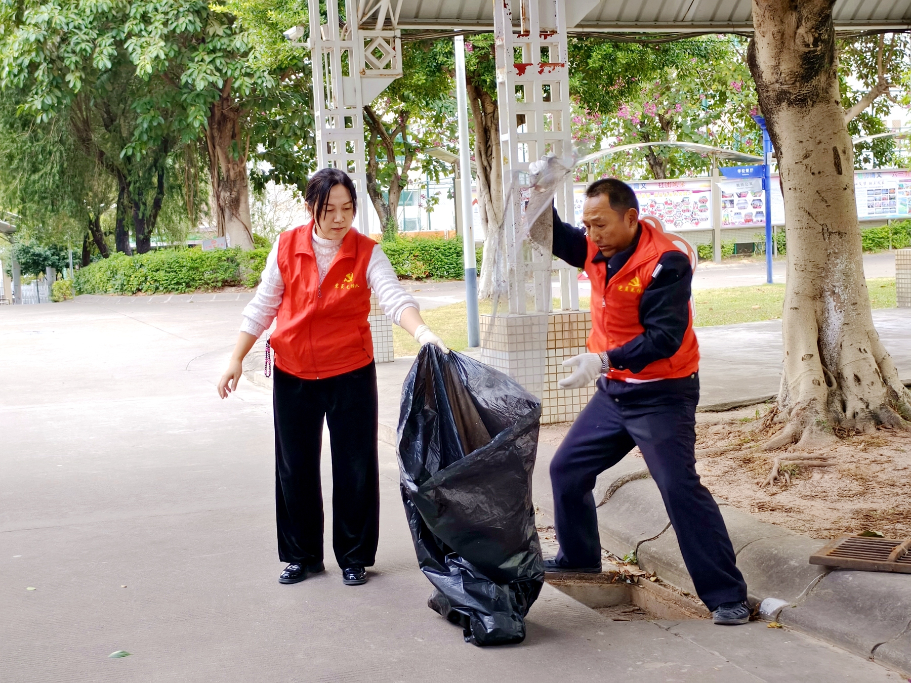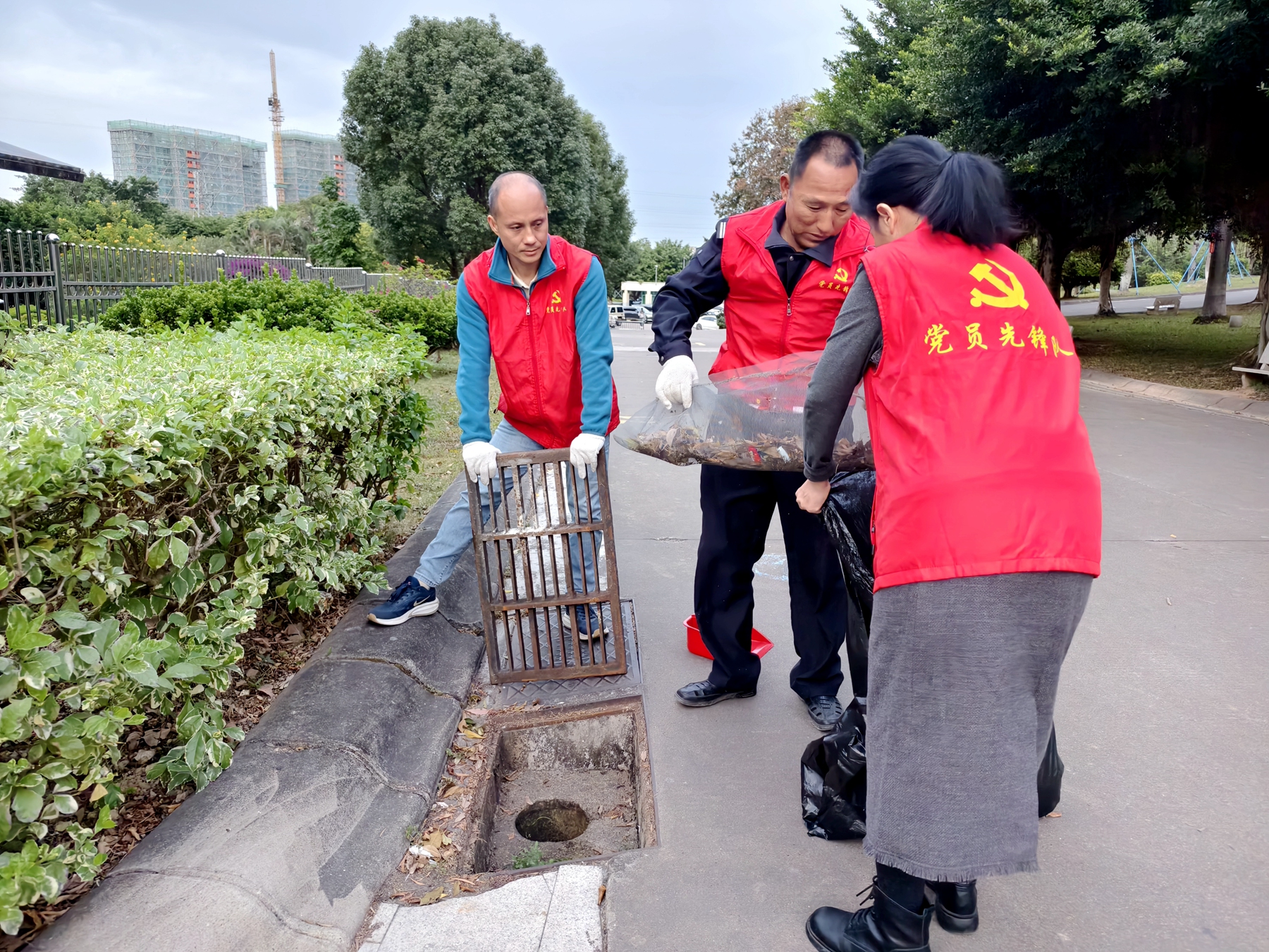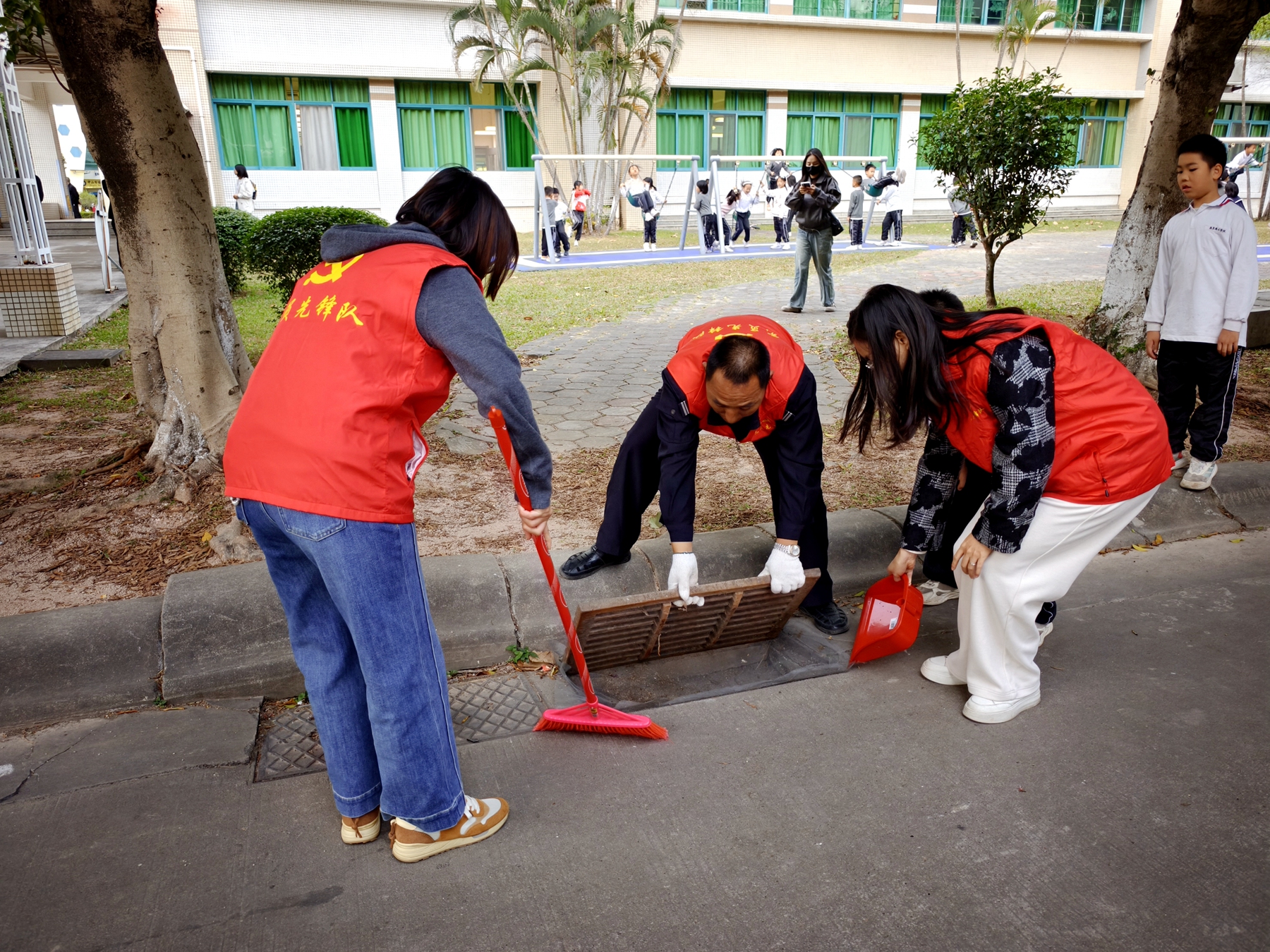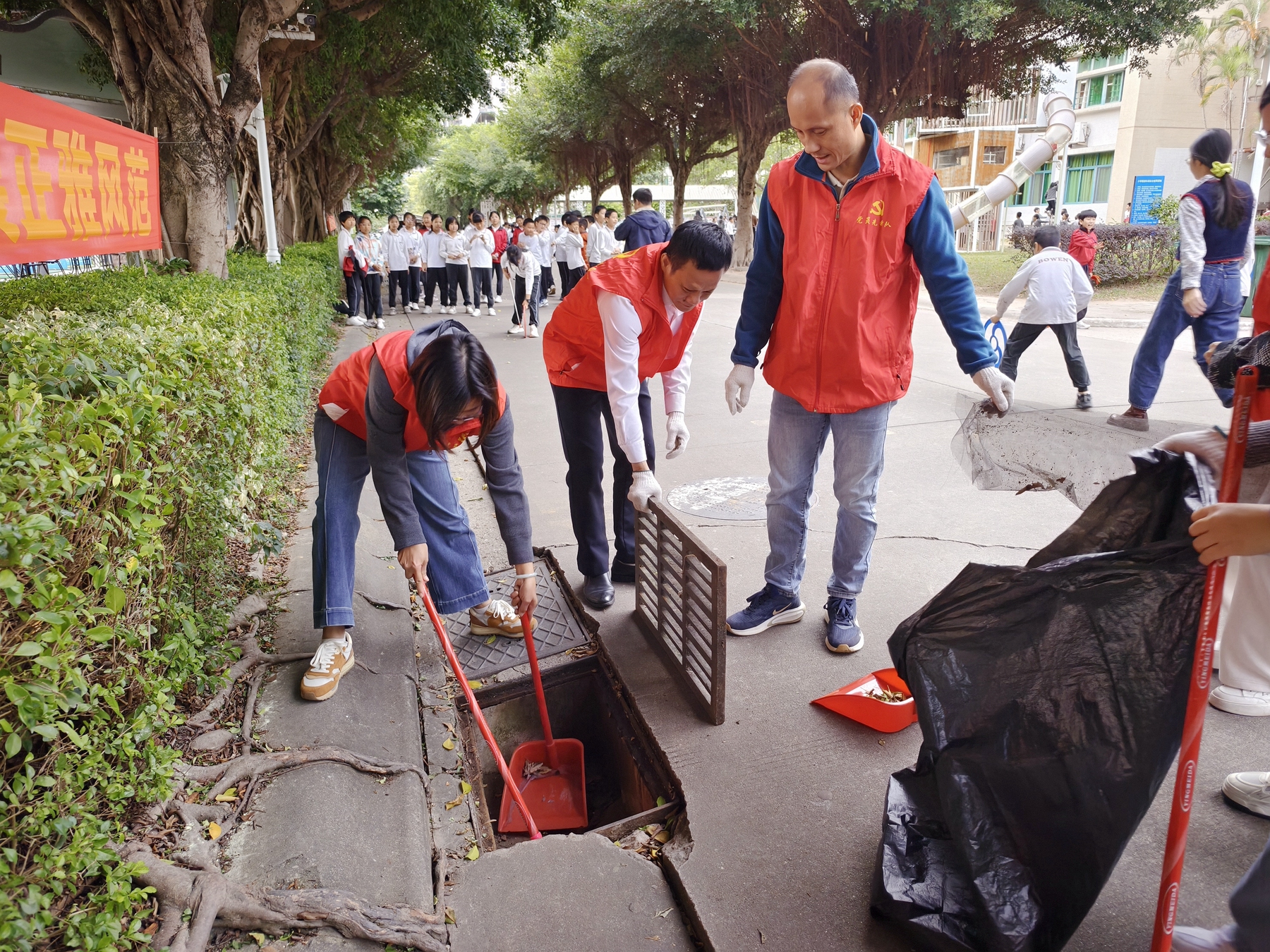 活动当天,党员志愿者们身着红色马甲,手持扫帚、簸箕、垃圾袋等工具,以党小组为单位,划分责任区域,对教学楼、宿舍楼、操场、主干道周边的所有排水口进行了“拉网式”的排查与清理。大家分工明确,配合默契,有的拉开沉重的雨水篦子,有的清掏淤积的落叶和污泥,有的用扫帚清扫散落的垃圾……现场一派热火朝天的劳动景象。尽管排水口内淤积的杂物散发着异味,但志愿者们没有丝毫退缩,充分发扬了不怕脏、不怕累的优良作风。经过大家的辛勤劳动,校园内的排水口都被彻底疏通,有效保障了排水系统的畅通,校园环境也变得愈发整洁靓丽。