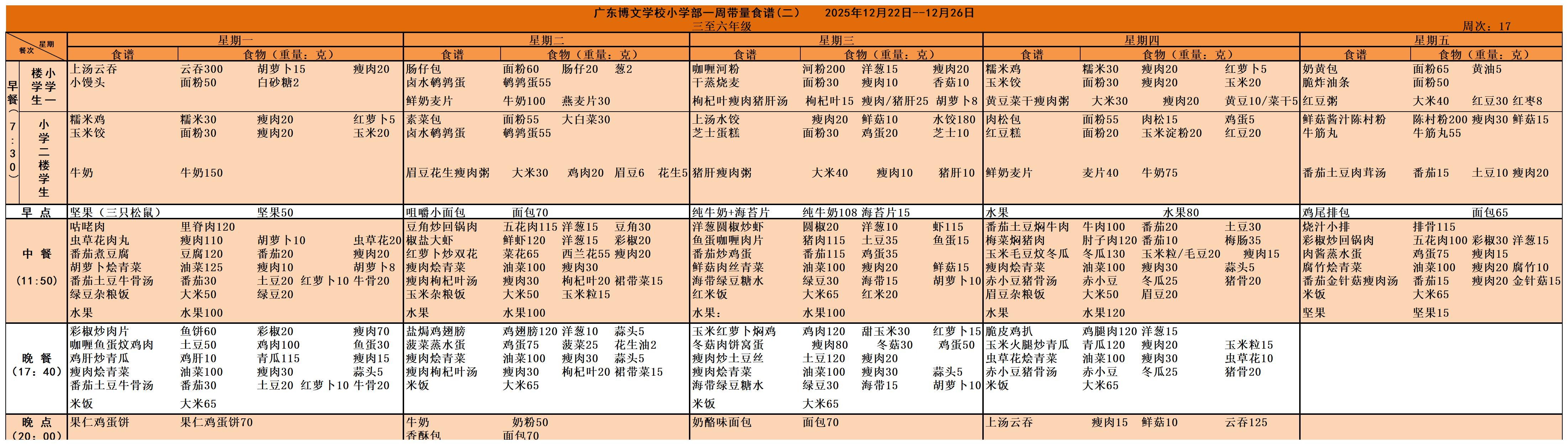 广东博文学校2025年秋季学期第十七周食谱公示