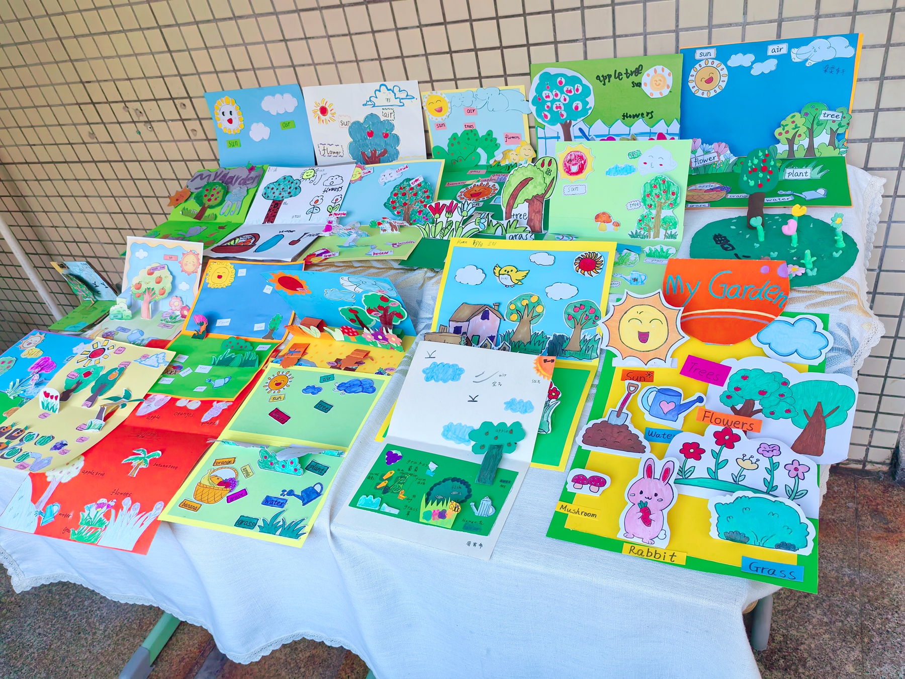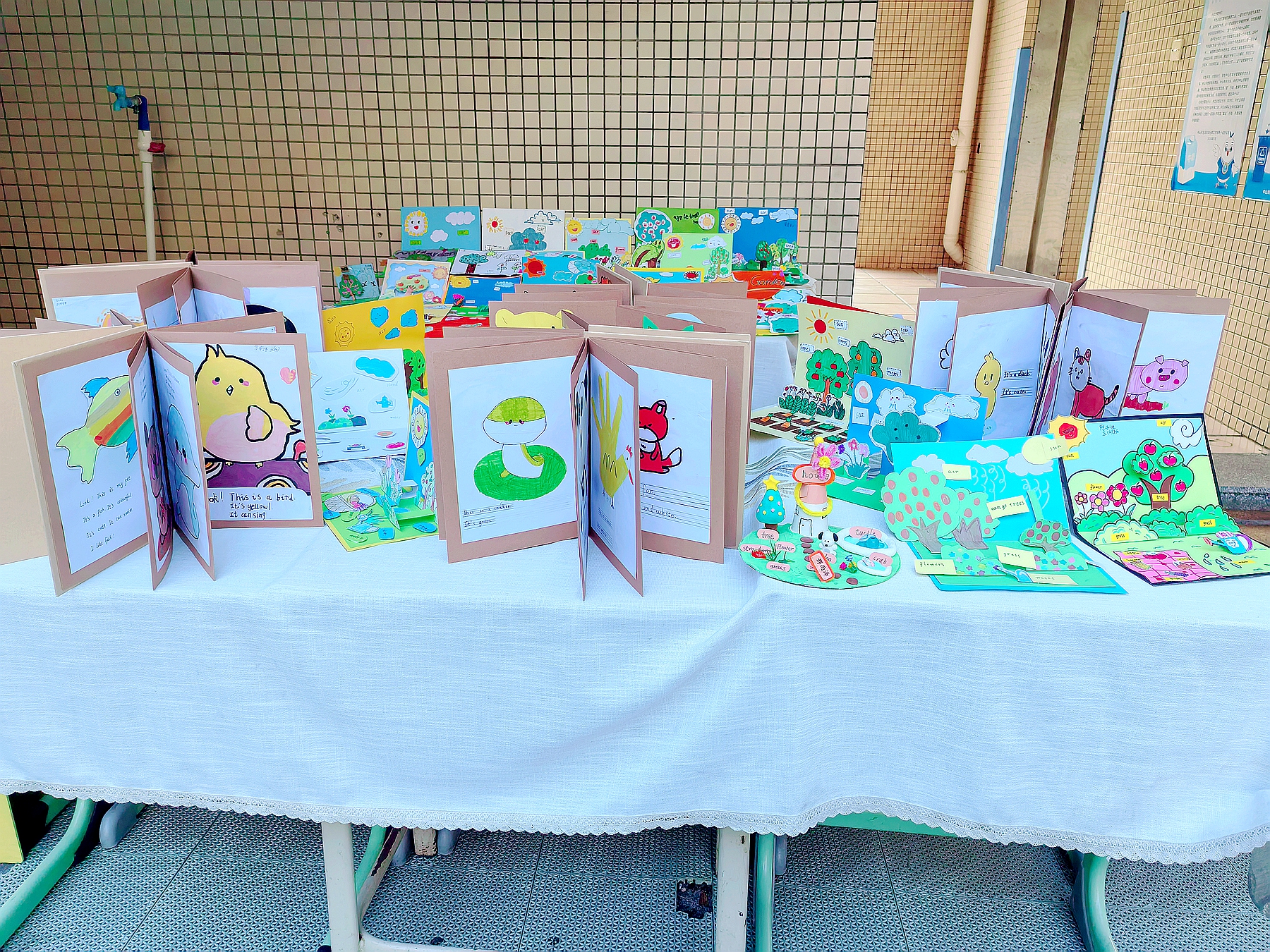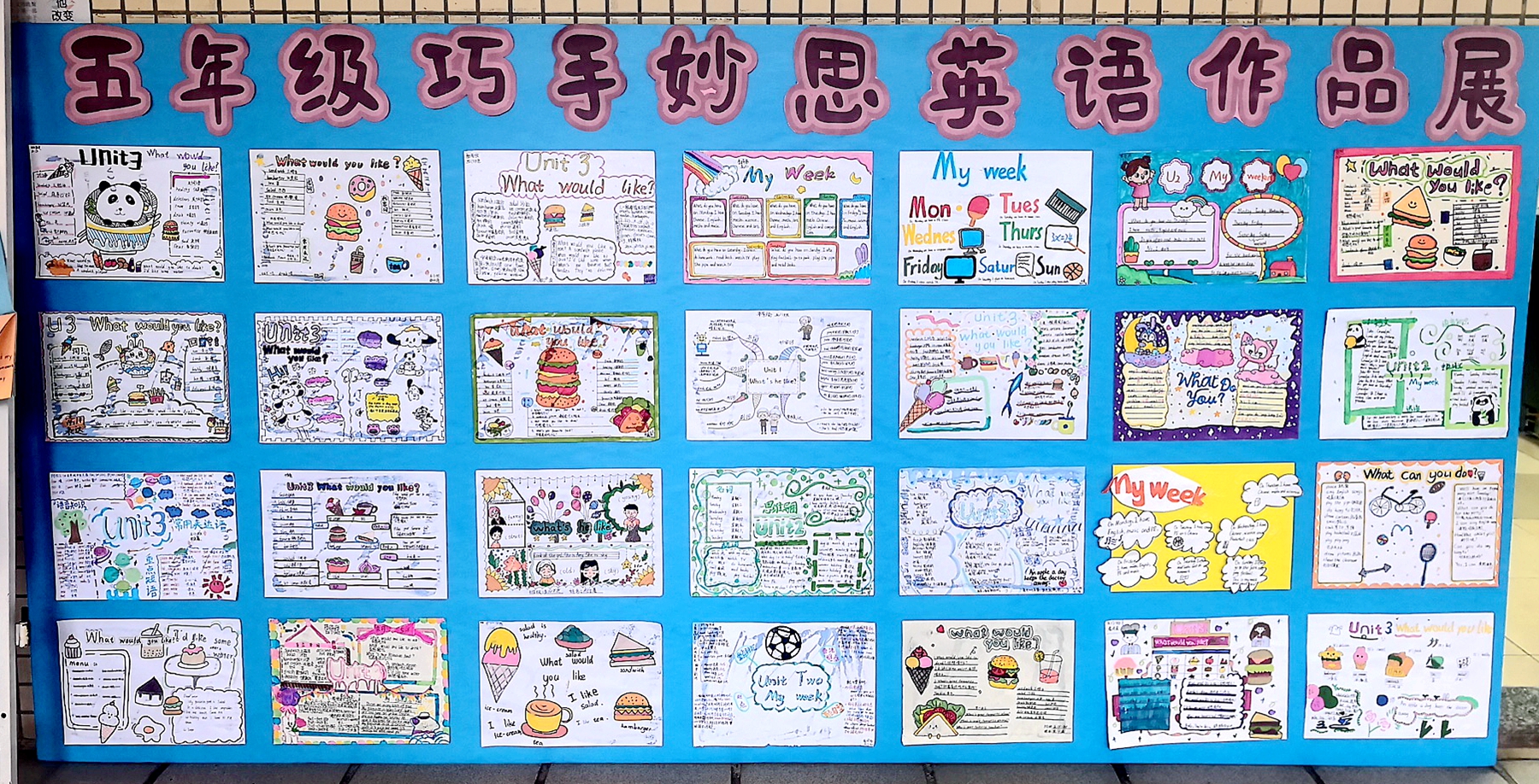 字母卡片拼出童趣满满的图案,情绪脸谱图玩转英语表达,《My week》主题故事书画出天马行空的想象……走廊里的作品展,每一件都是“英语+艺术” 的奇妙碰撞,路过的老师纷纷驻足拍照,为孩子们的创意点赞!
