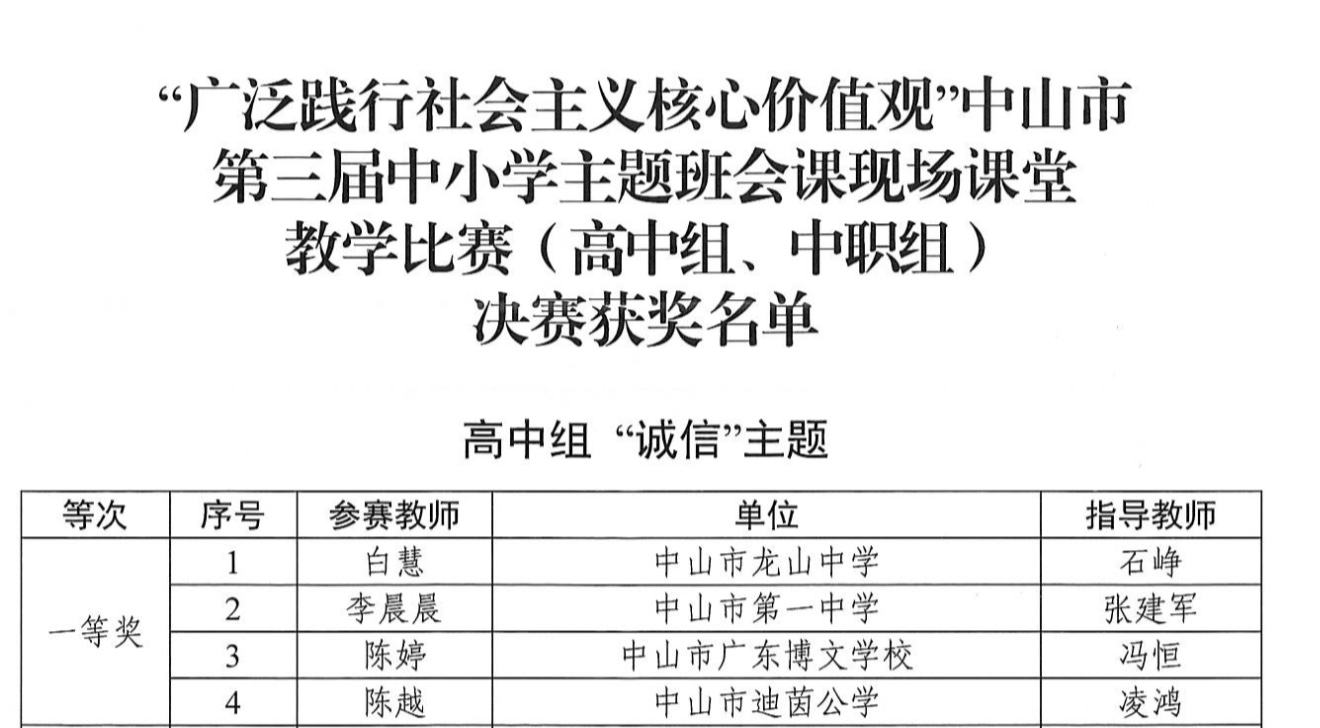 近日,中山市“广泛践行社会主义核心价值观”第三届中小学主题班会课现场教学比赛(高中组、中职组)市级决赛落幕。广东博文学校高中部陈婷老师凭借《诚信——发乎诚,止乎信》主题班会课脱颖而出,荣获高中组一等奖,指导老师为冯恒主任。这一荣誉既是陈老师个人教学能力的彰显,也体现了博文高中部的集体智慧与德育工作成效。
