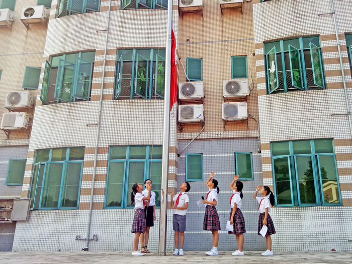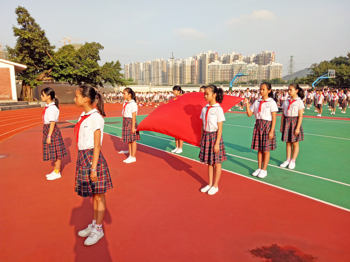 9月10日,踏着晨露的清新透彻,广东博文学校小学部在操场举行了新学年第一次升旗仪式。同学们身着统一校服,肃立升旗仪式现场。鲜红的国旗在国旗护卫队的护送下,迈着整齐的步伐,踏进升旗台。伴随着庄严的国歌声,全校师生目送鲜红的五星红旗缓缓升起。