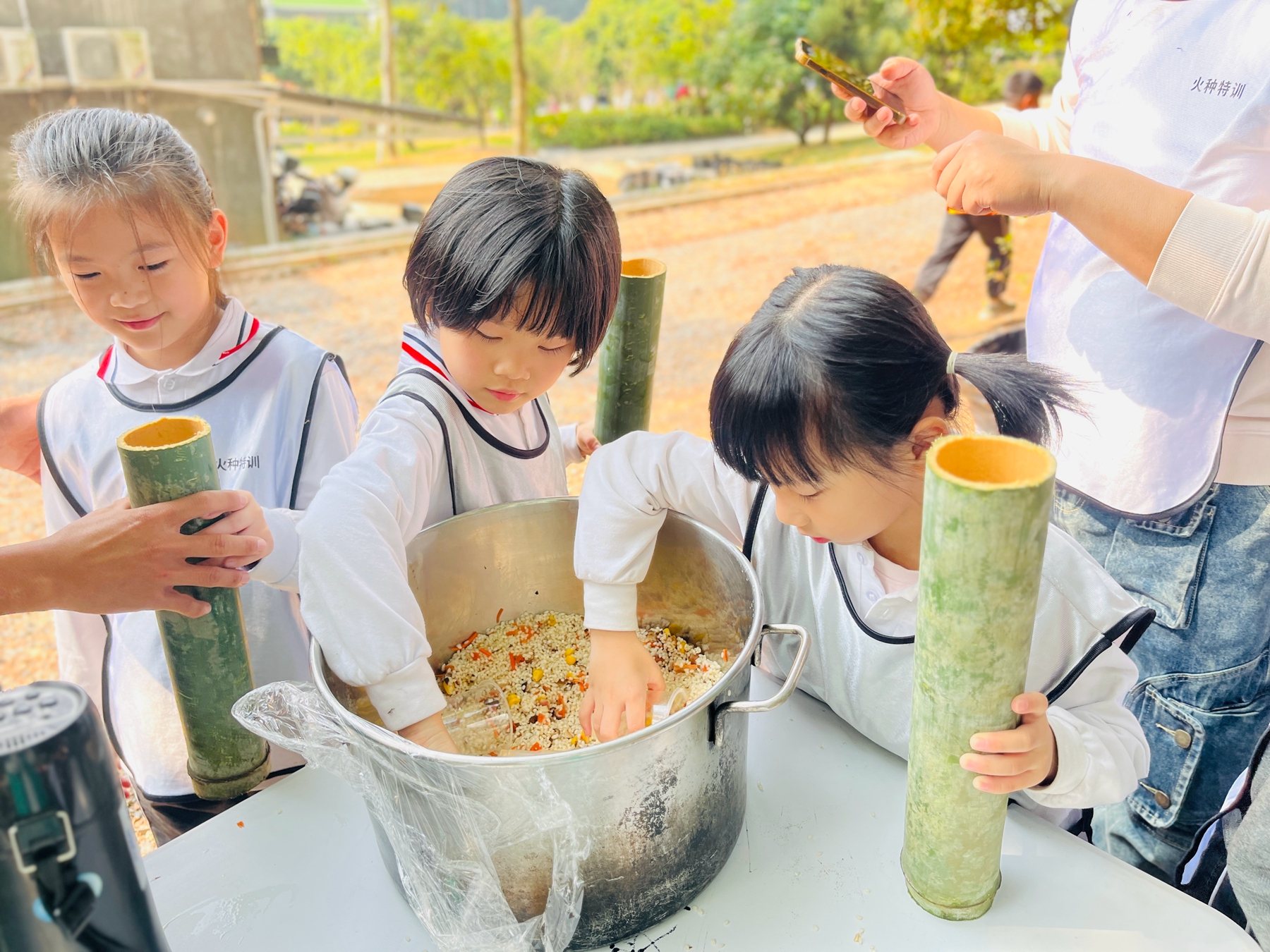 活动尾声,大家围坐在一起分享亲手制作的竹筒饭与烧鸡,软糯的米饭混着竹香,鲜嫩的鸡肉带着烟火气,孩子们捧着热气腾腾的美食,脸上满是劳动后的自豪。“这是我吃过最好吃的饭,因为是自己做的!”一位同学的话引来现场阵阵欢笑。