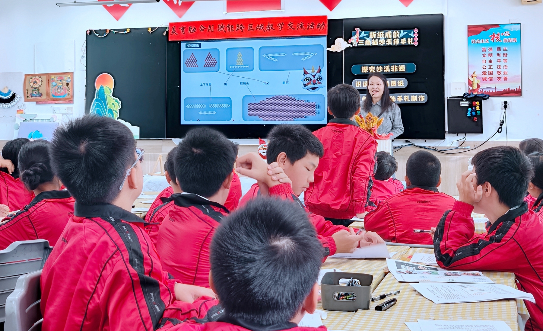 作为校际课题交流核心校,课堂教学展示活动率先拉开帷幕。广东博文学校小学部严羽萌、沙溪龙瑞小学陈佩茹两位老师,分别为五、六年级学生呈现了两场AI 赋能的创意纸艺美术课。严羽萌老师利用AI技术以“穿越千里江山图”为导入,带领学生沉浸式寻古桥探现代桥观中山桥,最后引导学生以废旧纸板为材料,亲手搭建深中大桥模型。陈佩茹老师则带来《折纸成韵》三角插沙溪伴手礼——沙溪非遗主题课,带领开发区学子领略沙溪纸艺风采,以三角插为核心主线,深挖中山非遗特色与传统文化底蕴,引导学生识读工艺图纸、感受三角插拼接的独特艺术,课堂氛围热闹非凡,最终带领学生亲手制作出兼具沙溪韵味的三角插伴手礼。课堂上,两位老师巧用 AI 技术辅助创意构思,从主题立意、造型设计到色彩搭配全程赋能,将传统纸艺与现代科技深度融合,帮助学生拓宽创作思路,直观感受传统工艺与科技创新碰撞的独特魅力。课后,两校教师围绕美育融合教学展开深入研讨,为课题研究注入了鲜活的实践动能。