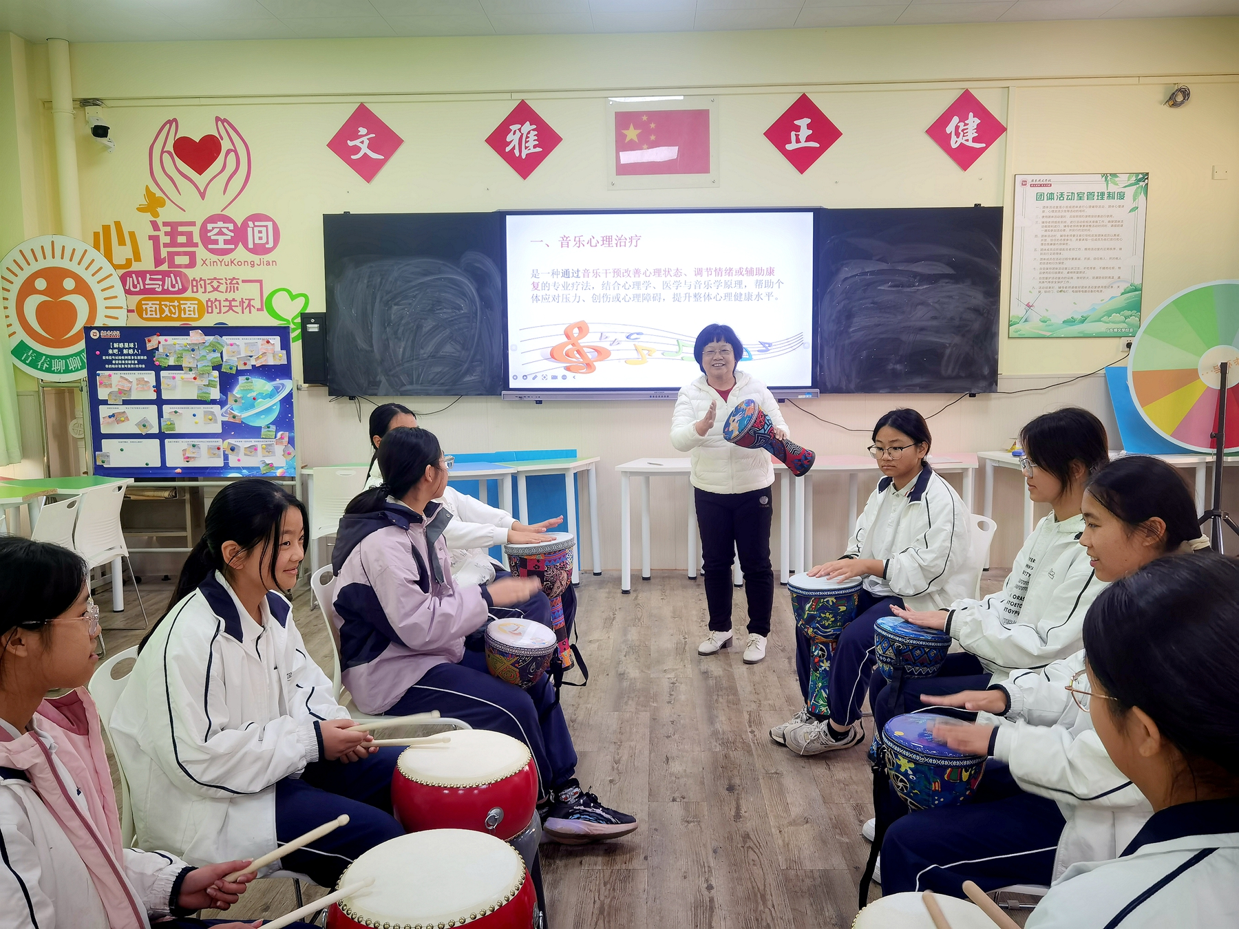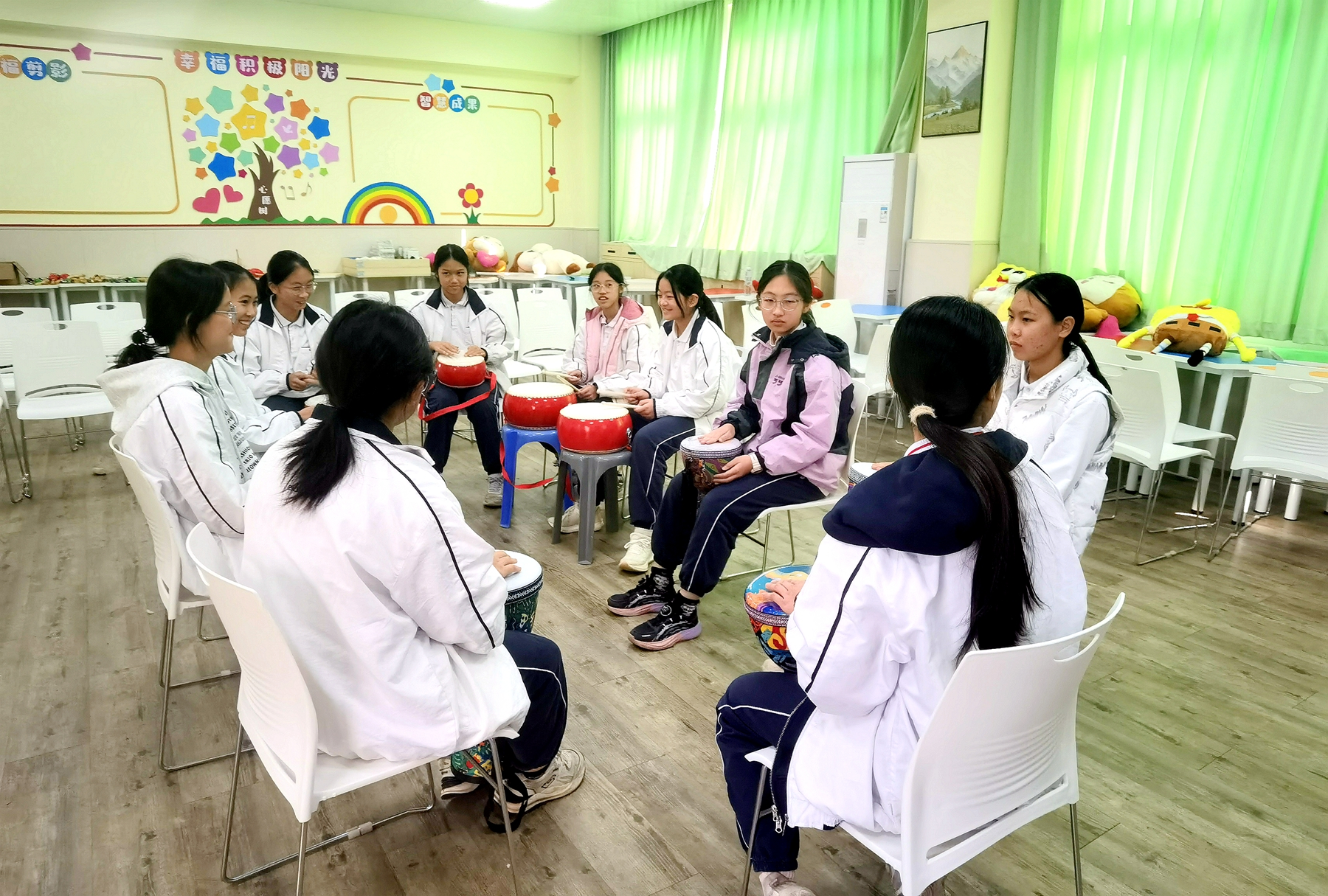 音乐疗法体验活动借鉴音乐疗愈模式,设计了兼具趣味性与疗愈性的 “鼓圈共振”体验,学生们围坐成圈,在郑璞玉老师的专业指导下,使用非洲鼓、沙锤、摇铃等各式打击乐器进行即兴合奏,鼓点成为连接彼此的纽带,帮助同学们在集体的节奏脉动中放下拘谨,增强归属感与协作意识。这些沉浸式体验让同学们在艺术表达中实现了情绪的释放与自我觉察的提升。