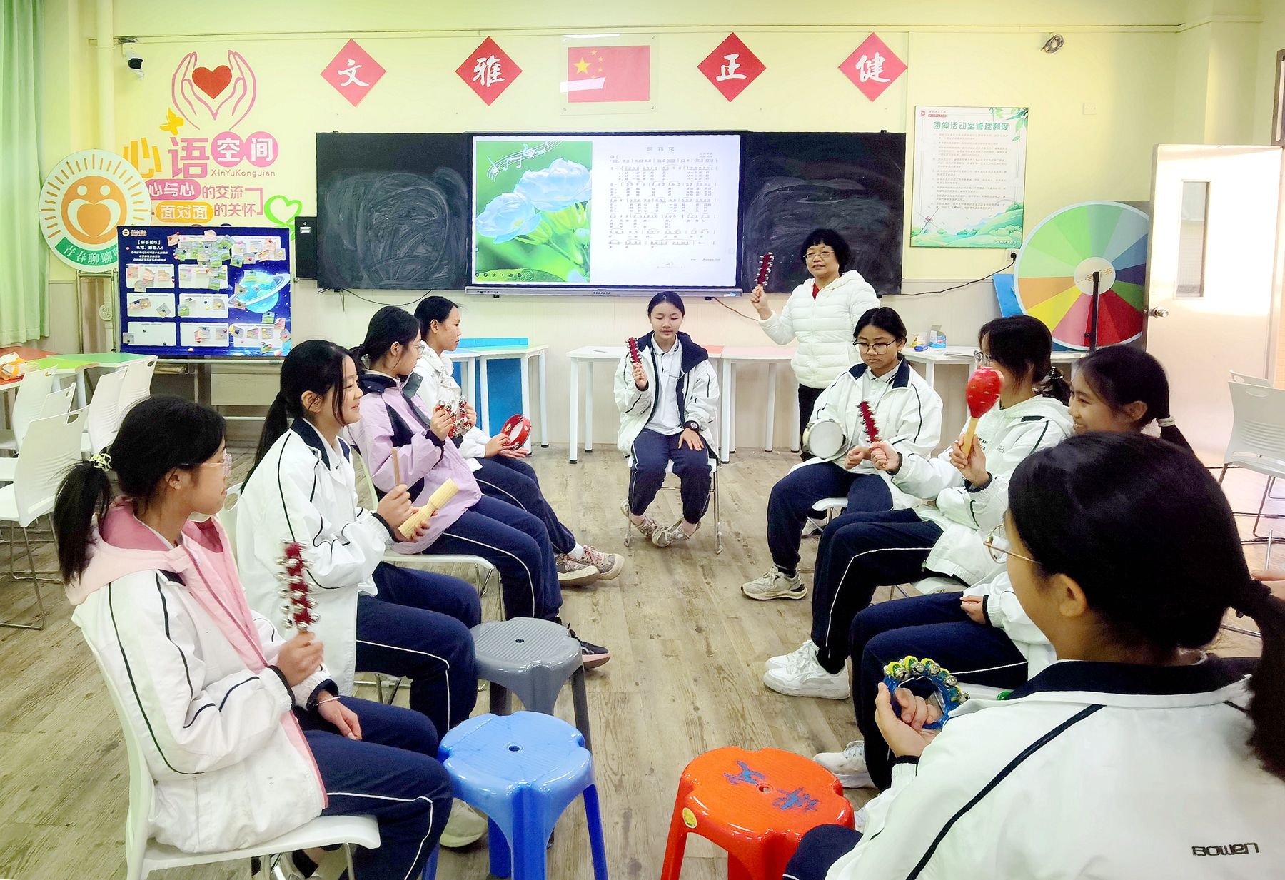 为创新心理健康教育形式,提升学生心理调适能力,近日,广东博文学校初中部心理社团开展了主题为“心弦共鸣,乐享心声”的音乐疗法体验活动,活动旨在通过音乐媒介,为学生搭建一个释放压力、表达情绪、促进心灵成长的互动平台。