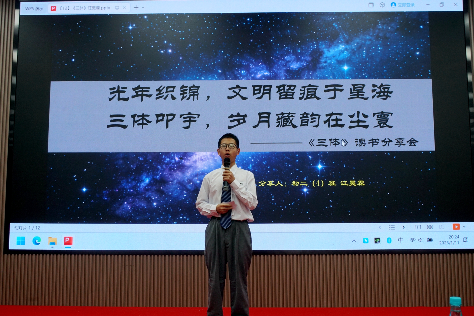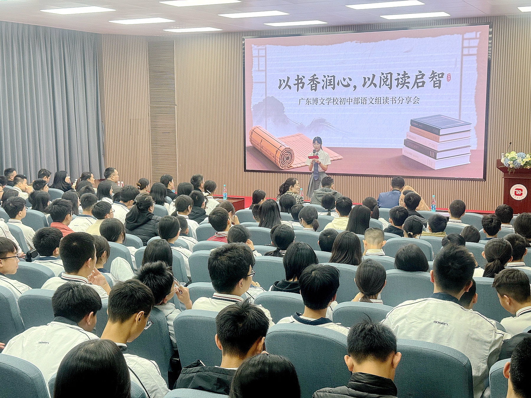 1月11日晚,广东博文学校407报告厅内书香氤氲、掌声阵阵,初二年级读书分享会在此顺利举行。本次活动以书为媒搭建交流平台,吸引了全年级12组选手同台竞技,现场师生齐聚一堂,共赴一场思想碰撞的阅读盛宴。本次特邀教务主任兼初二年级组长余甜老师;德育主任孟江垒老师;语文科组长徐连平老师;初三语文备课组长张福老师;初一语文备课组长曾赟老师;语文老师丁敏、谈会斌老师担任本次比赛的评委。