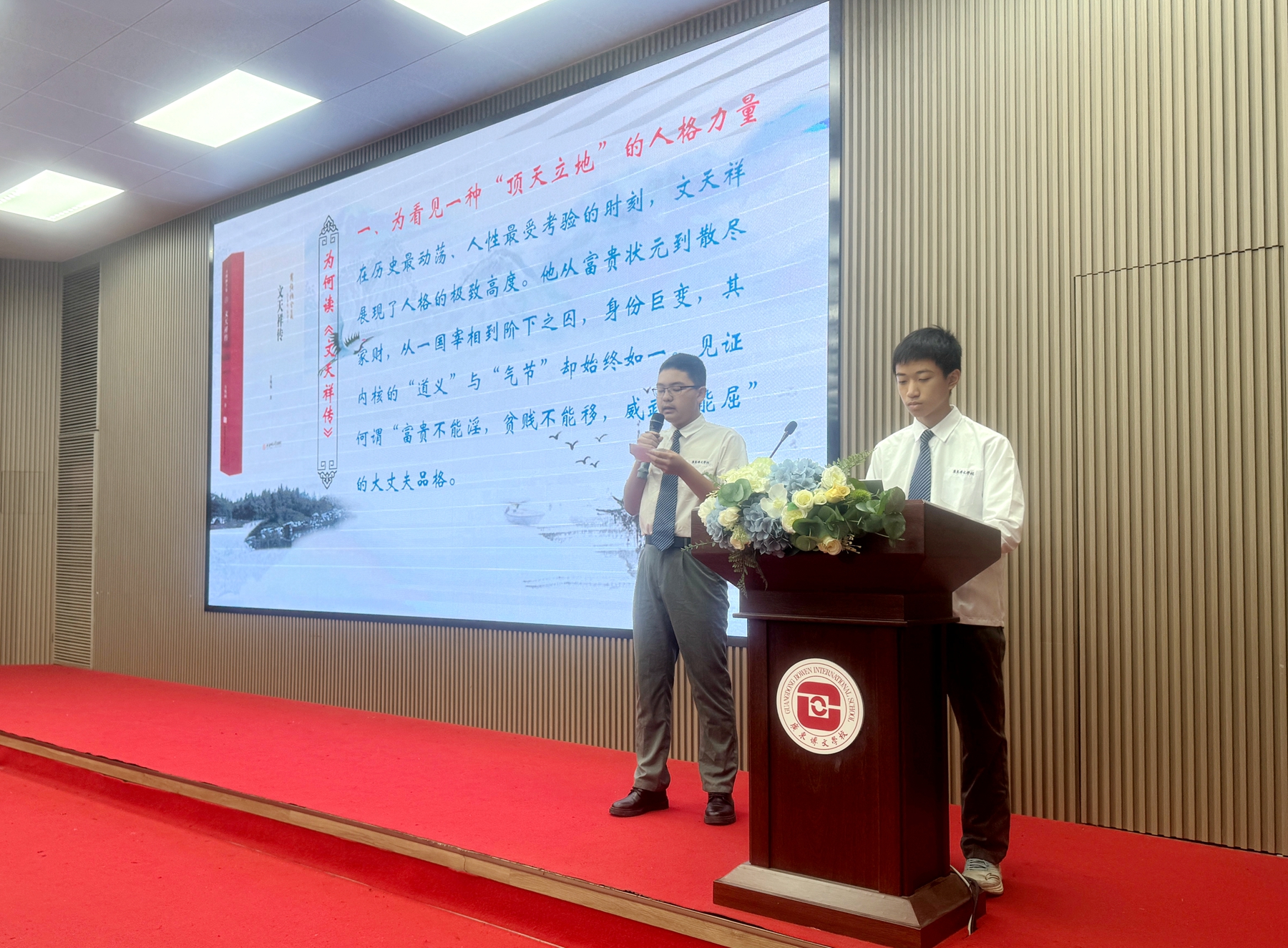 分享会上,各参赛小组依次登台,围绕经典名著、名人传记、校园之歌等多元主题展开分享。选手们或深情诵读经典片段,或结合自身感悟解读书中哲理,或通过情景演绎再现故事场景,将阅读心得与青春思考融为一体,展现出扎实的阅读积累与出色的表达能力。精彩的分享不时引发台下共鸣,现场互动氛围热烈,充分彰显了博文学子对阅读的热爱与探索精神。