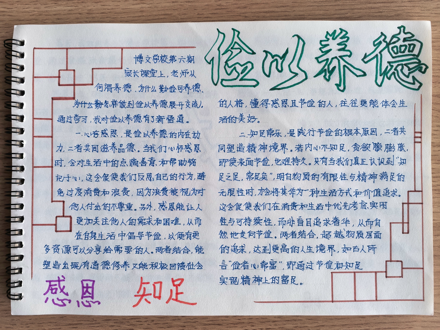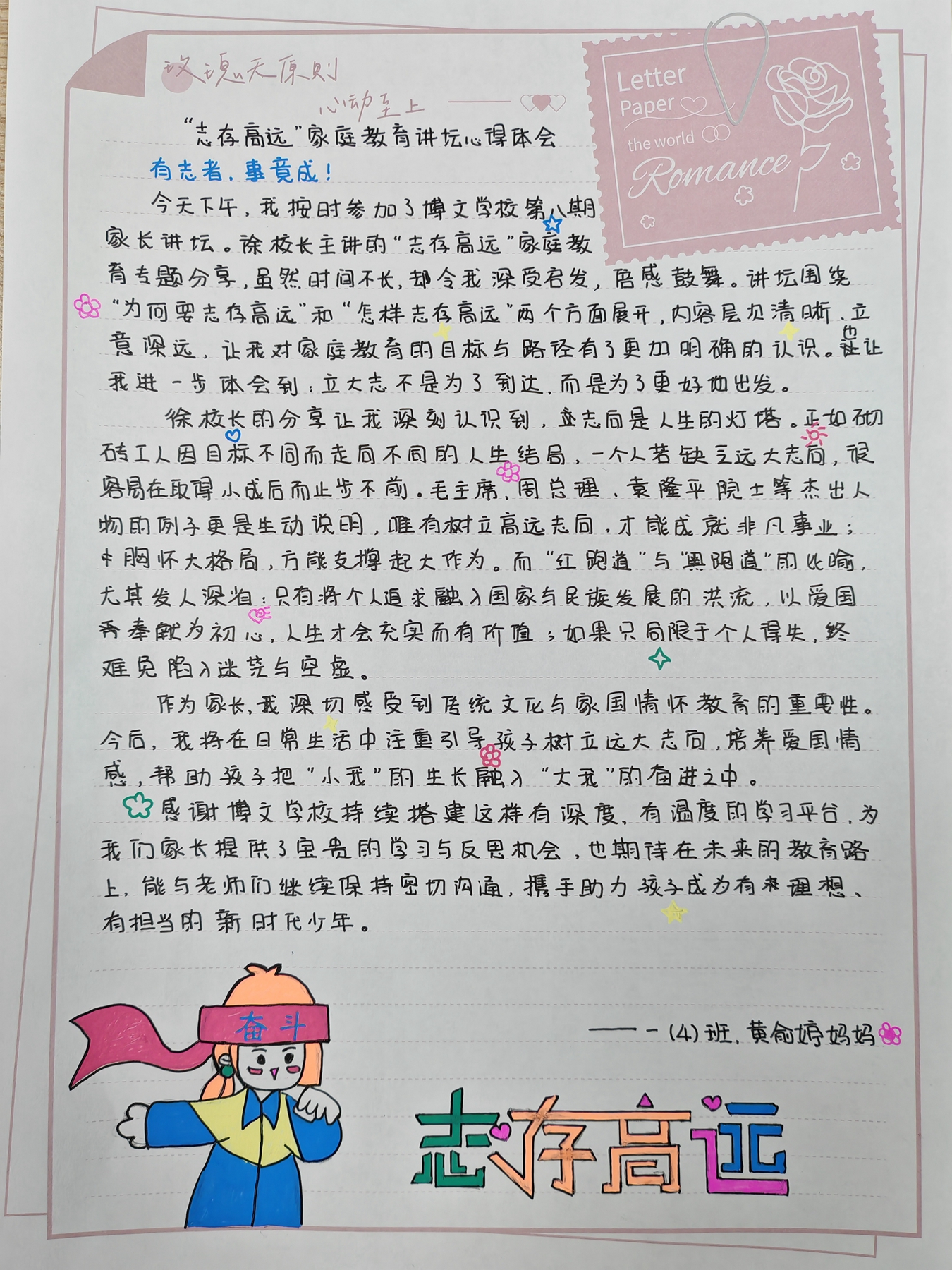 活动落幕之后,一股股饱含温度的反馈也从各个家庭涌来。不少家长提笔写下心得体会,一笔一划皆是育儿路上的思考与收获;更有心细的家长,特意配上孩子认真听讲的照片、亲子互动的温馨手绘,让字里行间的感动愈发具象。有的家长在笔记里写道:“《童蒙养正》这一课,让我明白好品格的养成不在说教,而在日常的点滴言传身教。”还有家长分享道:“线上听课的时候,孩子凑在旁边一起听,还主动跟我讨论‘什么是利他’,这样的家校课堂,连孩子都跟着受益匪浅。”这些带着墨香与心意的文字和图画,既是对本次家长讲坛的肯定,更成为家校共育之路上,最珍贵的一份纪念。