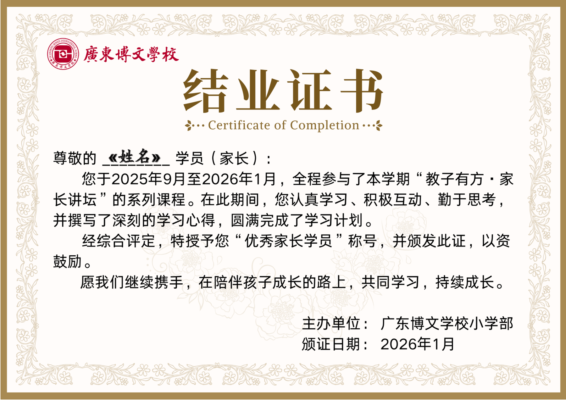 为表彰家长们的认真参与和用心付出,广东博文学校小学部还为每位全程参与的家长精心准备了结业证书。证书上不仅记录着家长们参与“教子有方·家长讲坛”系列课程的成长轨迹,更授予了“优秀家长学员”的荣誉称号,这一纸证书,既是对家长育儿学习的认可,也是家校携手共育的又一见证,让这份成长的约定,在新的一年里继续温暖前行。